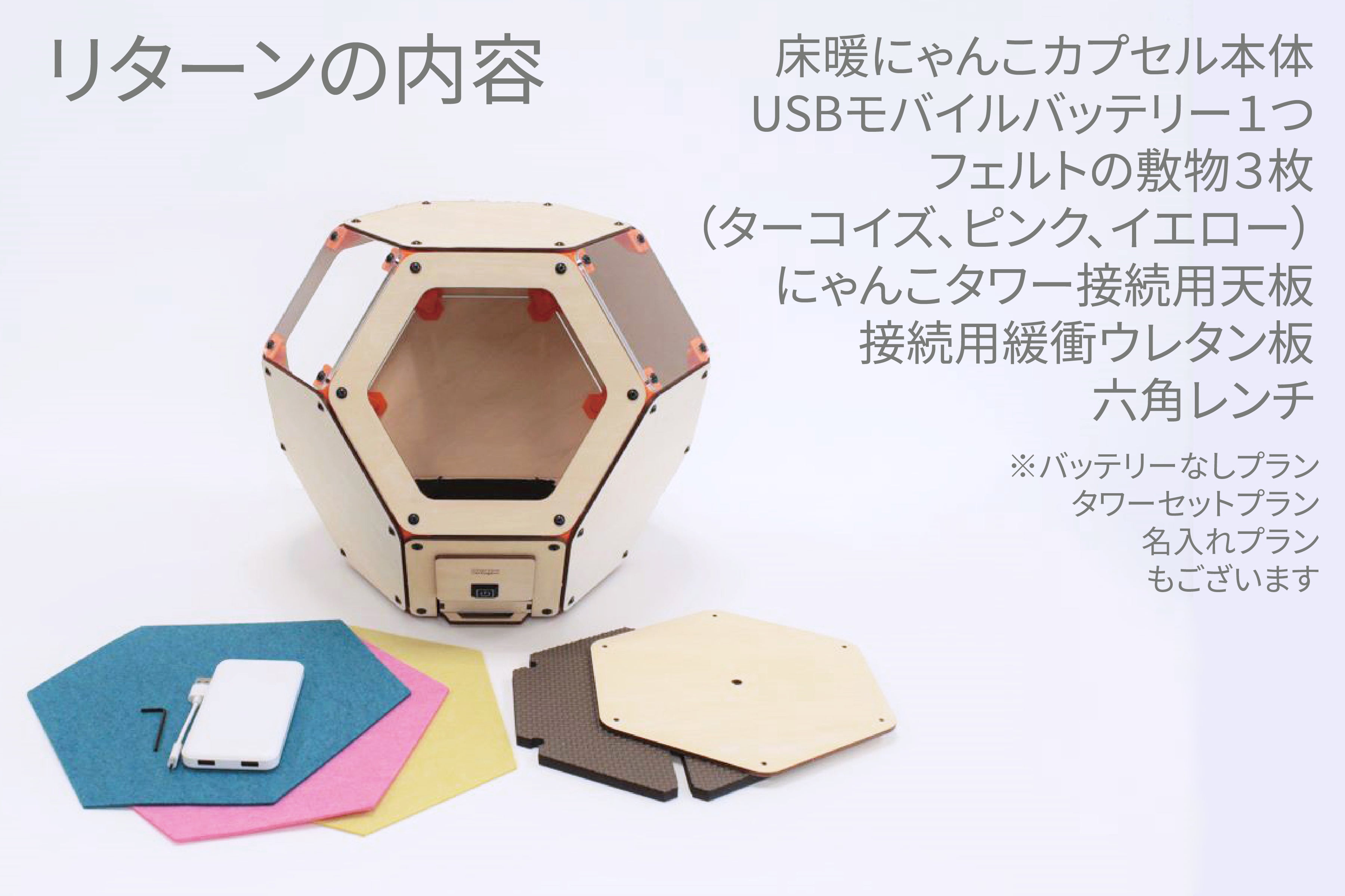 床暖にゃんこカプセルは、カプセル本体、USBモバイルバッテリー1つ、フェルトの敷物3枚(ターコイズ、イエロー、ピンク)、にゃんこタワーに接続するための交換用天板と緩衝ウレタン板、パネルの位置を交換するための六角レンチです。専用のお箱でお届けいたします。