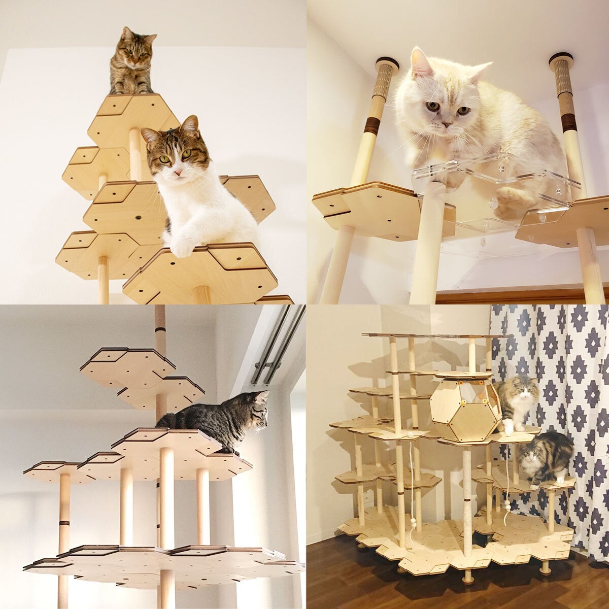 自由に組み替えできる木製キャットタワー。詳しくは、にゃんこタワー公式ウェブサイトもしくは、にゃんこタワー公式YouTubeアカウントをご覧ください。