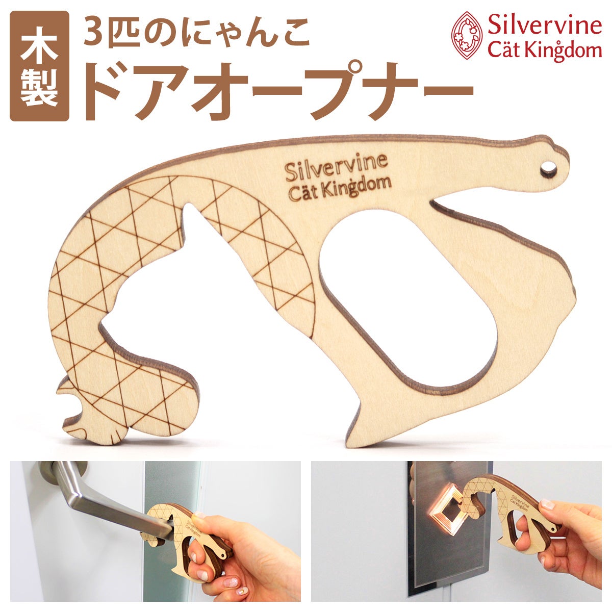 床暖にゃんこカプセルやにゃんこタワーを作る木の端材で製作した、木製のドアオープナーです。7種類のデザインをご用意しています。