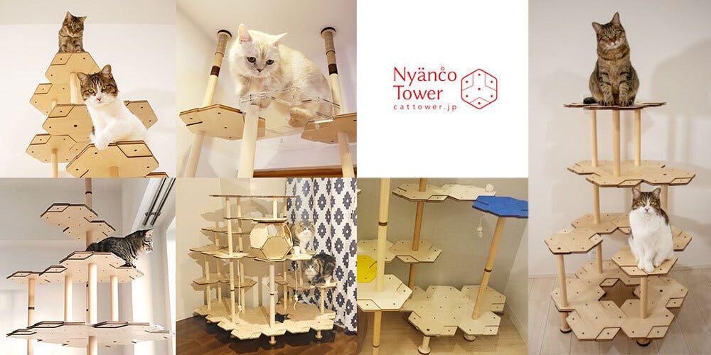 私たちは「猫さんにも飼い主さんにも、環境にもよい」、このことにこだわって製品を作り続けてきました。代表的な商品は、特許取得の六角形のヘキサパネルを組み合わせてつくるにゃんこタワーです。