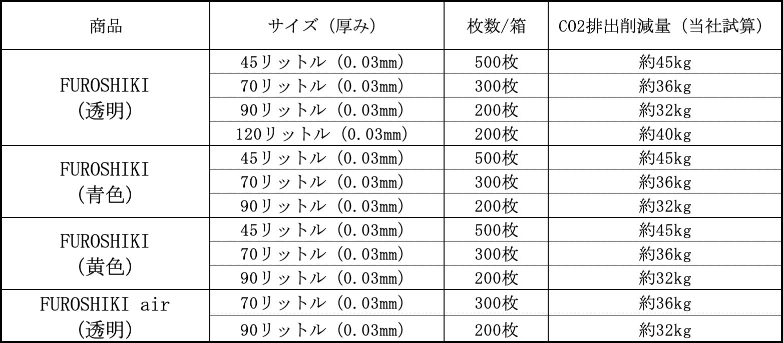 A. 従来のゴミ袋を作る際に排出されるCO2量から、FUROSHIKI (air)を作る際に排出されるCO2を差し引いた数値を「CO2削減量」としております。