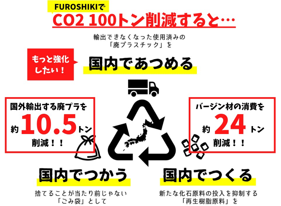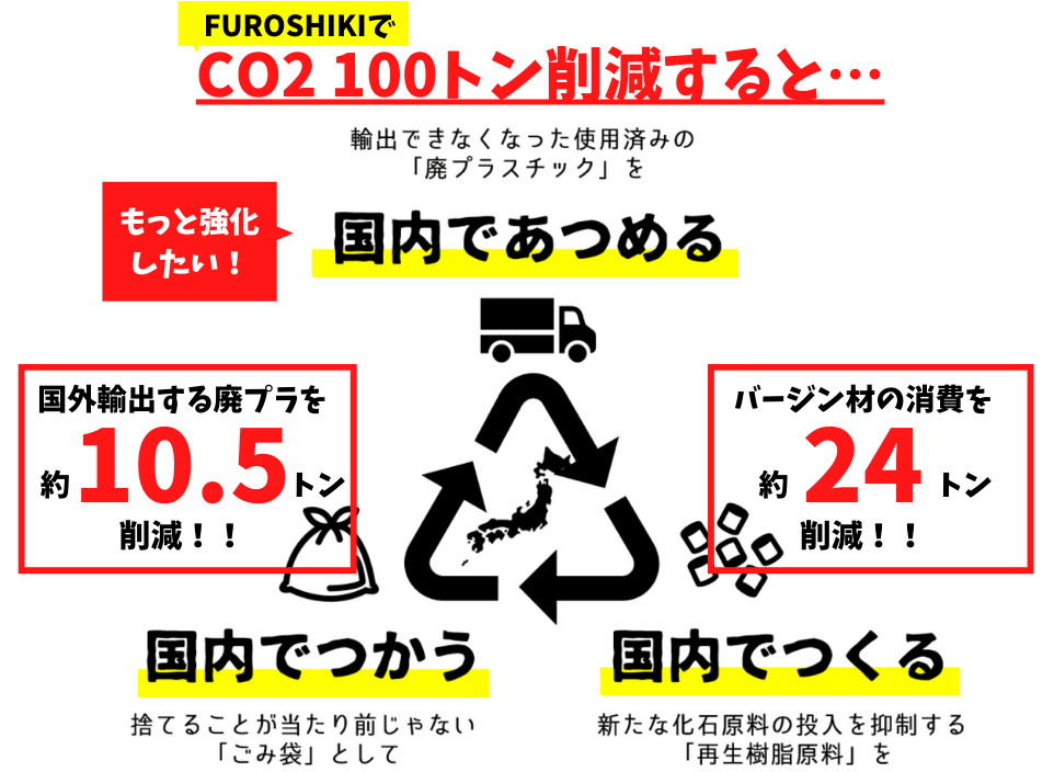 本プロジェクトでは「平均的な車で地球を11周半弱(約44万km)走った時の排出量」分と同等の「CO2排出量100トン」をFUROSHIKIを使用することで削減しようと考えました。