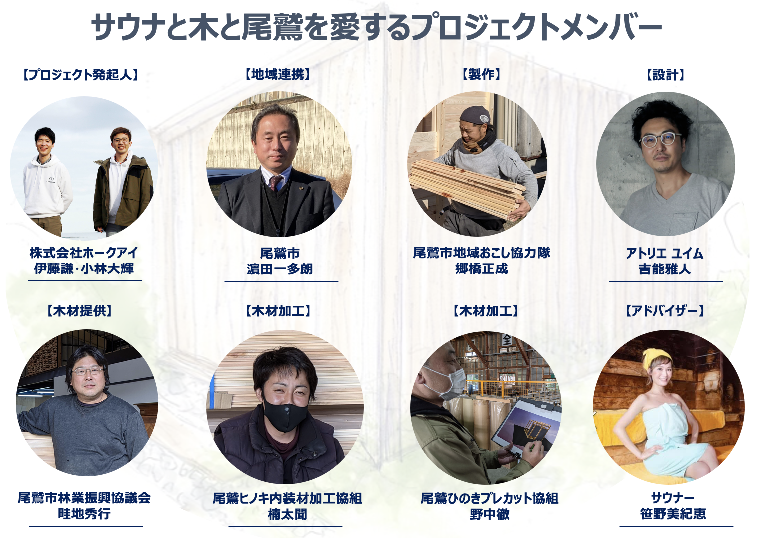 このキーワードを胸に、一人ずつ構想についてお話しさせていただきました。見ず知らずな存在でありつつも、サウナ構想に共感いただき、それぞれのプロフェッショナルな方々にメンバーとして加わっていただきました。そんなステキなプロジェクトメンバーがこちらです!