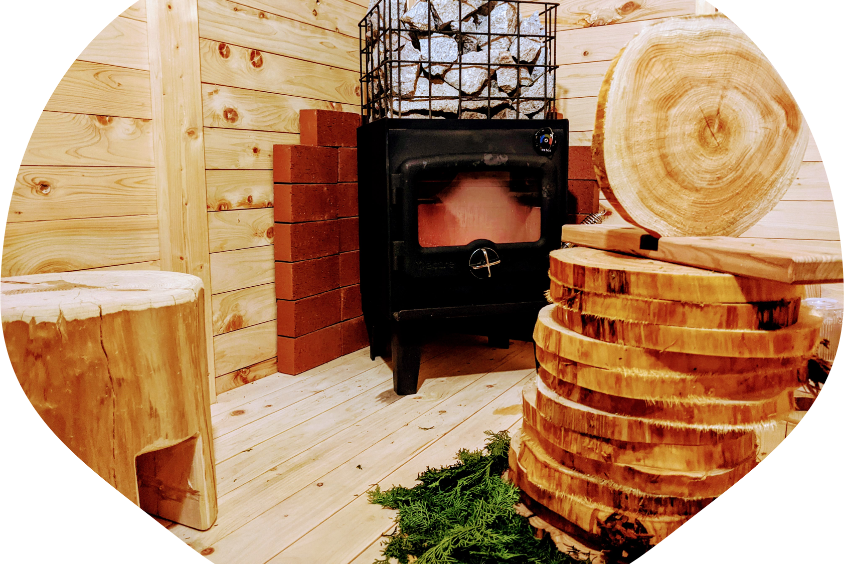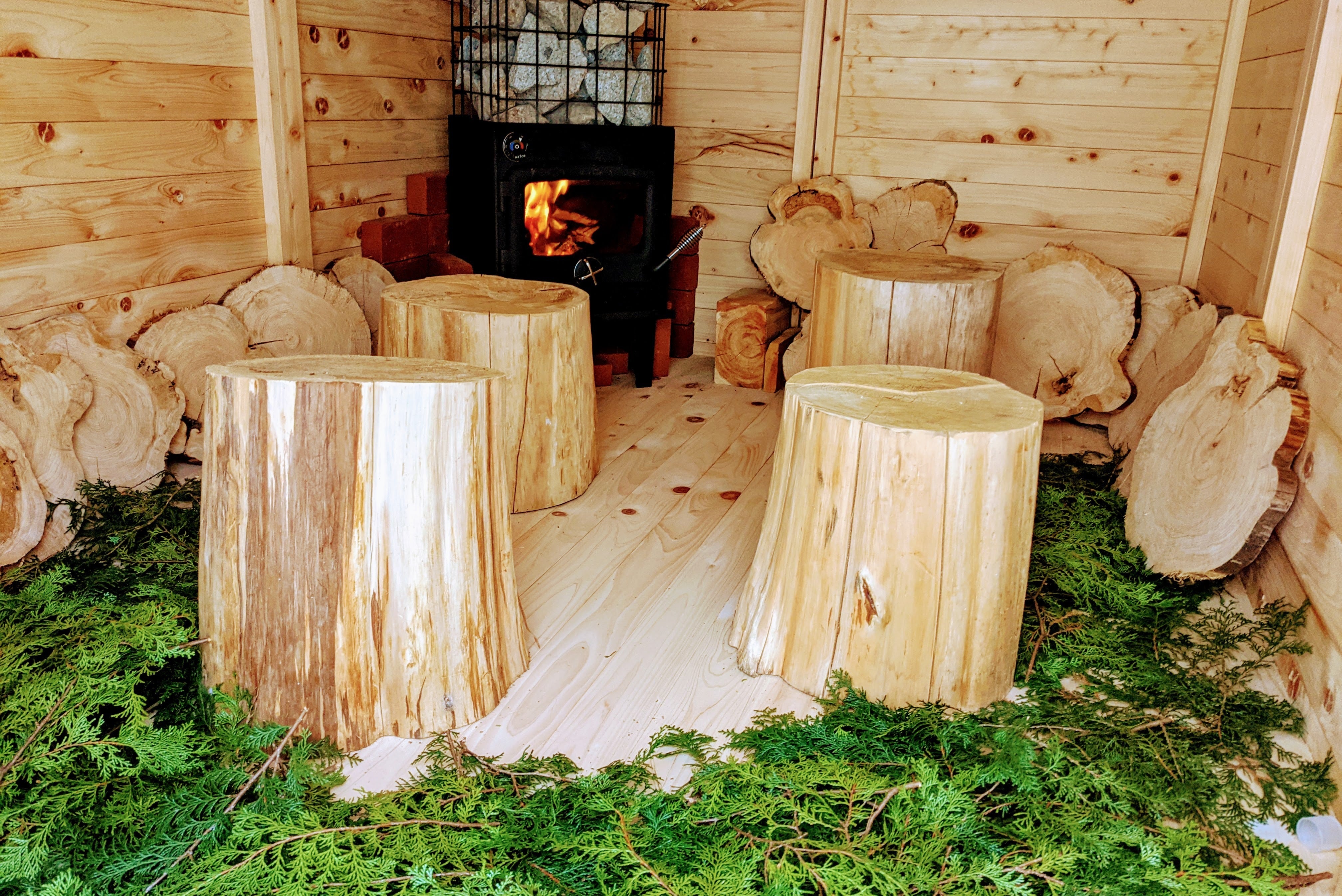 乾燥前の生木をふんだんに配し、木の内に秘められた水分を体感できる仕掛けを考えました。生木の水分は乾燥時に発出されるものですが、化粧水のように肌に馴染みます。カラダを温めつつ、髪や肌を優しく守りながらカラダを温められる、お子さん、女性の方、ご高齢の方に嬉しい体験を提供します。