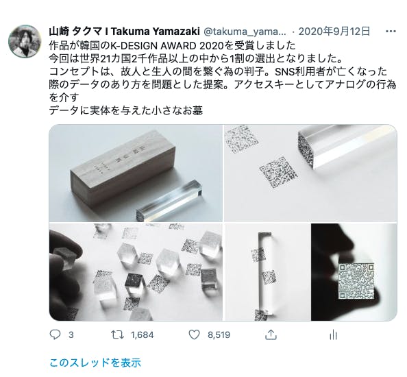 ・K - DESIGN AWARD2020受賞 - 21カ国2,199 作品 の中から約1割の選出となり受賞。