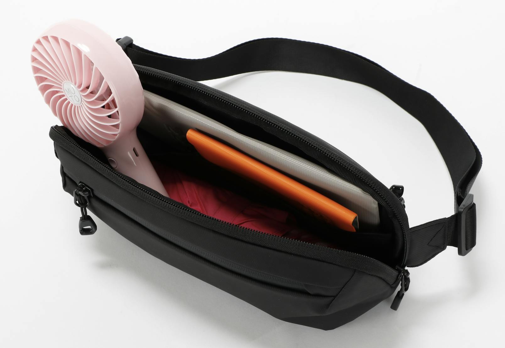 スマートフォン、パスポート、財布、折り畳み傘、 扇風機、鍵などをたっぷり入れて、両手フリーで手軽に外出することができます。