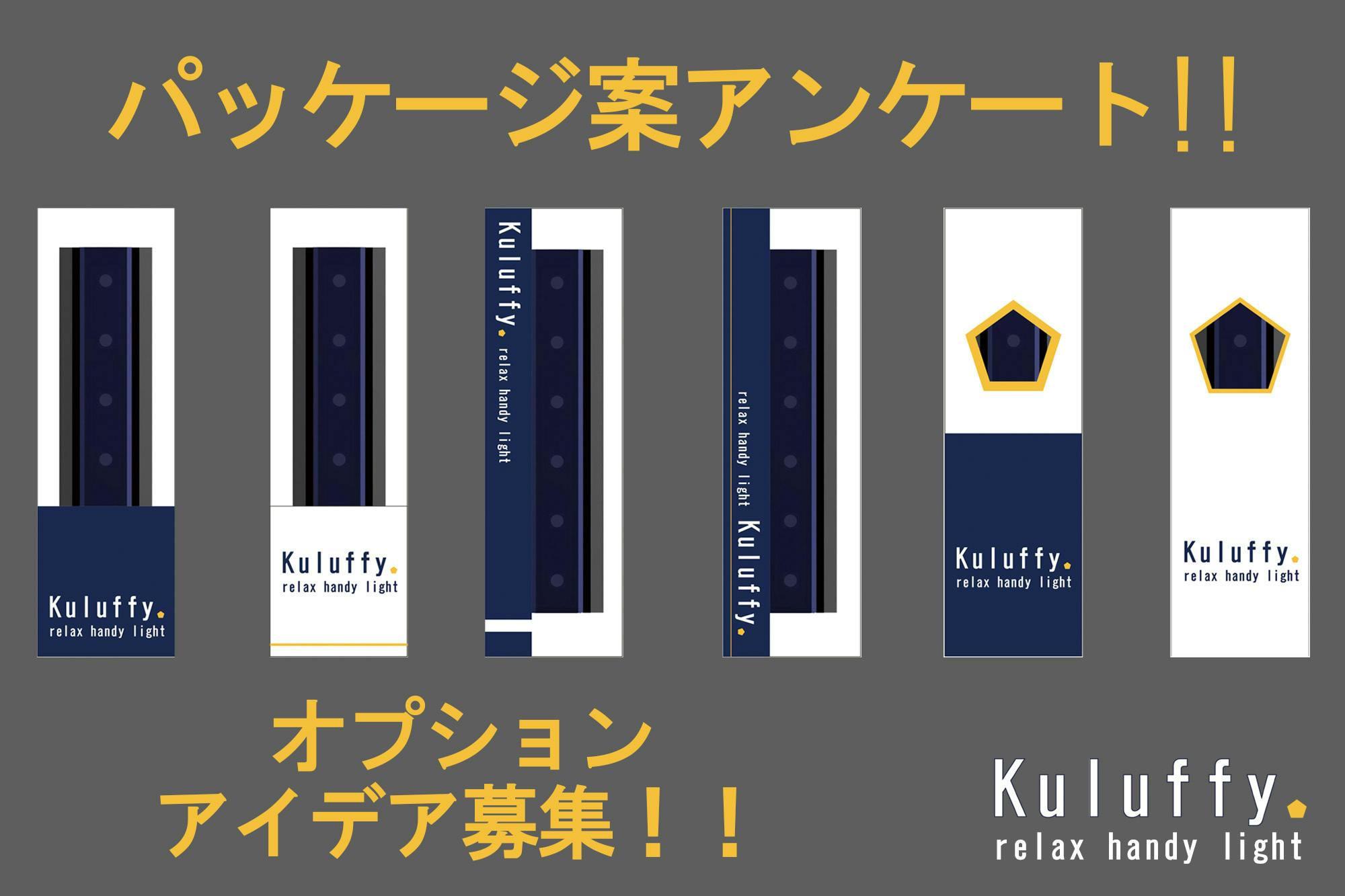2021/04/09 17:35Kuluffy(クラフィー)をご支援いただきました皆様、また、ご支援をご検討いただいている皆様、こんばんは!各メンバーが分担して発信してきました活動報告ですが、4回目です!支援金額が80万円を超えました、本当にありがとうございます!しかし、目標達成までは、まだまだ皆様のご支援が必要です。プロジェクトが成功し、皆様にkuluffy(クラフィー)をお届けできるように、掲載終了まであと少し!最後まで走り抜けていきたいと思いますので、よろしくお願いします!今回は、Kuluffy(クラフィー)のパッケージデザインのアンケートとオプションアイデアを募集したいと思います!皆様が、最初に目にするパッケージ、出来れば製品そのものだけでなく、パッケージでも喜んでいただこうと、デザインをたくさん検討しています。ベース色の濃い青、アクセントカラーの黄色、そして白の3色を使用し、Kuluffy(クラフィー)らしさをデザインできればと思っています。A案:スタンダードな縦型デザイン。クセのないベタなタイプ。B案:縦・横どちらでもOKなデザイン。全体が見えます。C案:モチーフの五角形の小窓からチラッと見せます。少し個性的です。いかがでしょうか?それぞれの案に2パターン(①・②)ありますので、気に入ったデザインをぜひ教えてください!私たちの中でも好みが分かれているパッケージデザイン。どのデザインが人気なのか、気になるところです!たくさんの方のご意見、お待ちしております!アンケートの方法は、【1】Twitter … https://twitter.com/kuluffy 【2】Instagram … https://www.instagram.com/kuluffy_light/ 【3】コメント … 掲載ページのコメント欄で! 【4】メッセージ … 掲載ページからメッセージで!※それぞれのSNSでのアンケート方法は、各ページにてご確認お願いします。できれば!これまであまり広げられていない、Twitterでの拡散をお願いしたいです!そしてもう一点お願いです!現状、Kuluffy(クラフィー)は1時間で自動消灯以外は、オンオフのみのシンプルな機能の製品ですが、ゆくゆくは様々なオプション等で機能を追加できればと考えています。例えば、アロマ付き、ストラップ、タイマー機能等、色々考えられますが、皆様からも「こんな機能が欲しい!」という声を聞かせてください!必ず実現します!とは言えませんが、今後の参考にさせていただきます!by 秋山(製品開発担当)こちらのご意見も、上記アンケート同様の方法で随時受け付けております!残すところ、あと17日。ご支援いただきました皆様のためにも、Kuluffy(クラフィー)を生産できるように、私たちができる事をやり切ります!あと少し、お付き合いをよろしくお願いします! もっと見る
