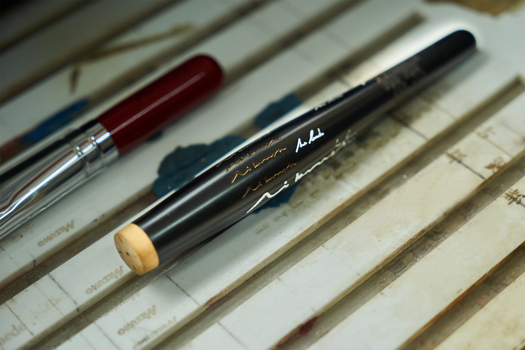 ②ナガキパーマさん、KotokaIzumiさん、鱗缶さんが「Ai brush」と「購入者の皆様が指定するお名前」を直筆し、化粧筆へレーザー刻印