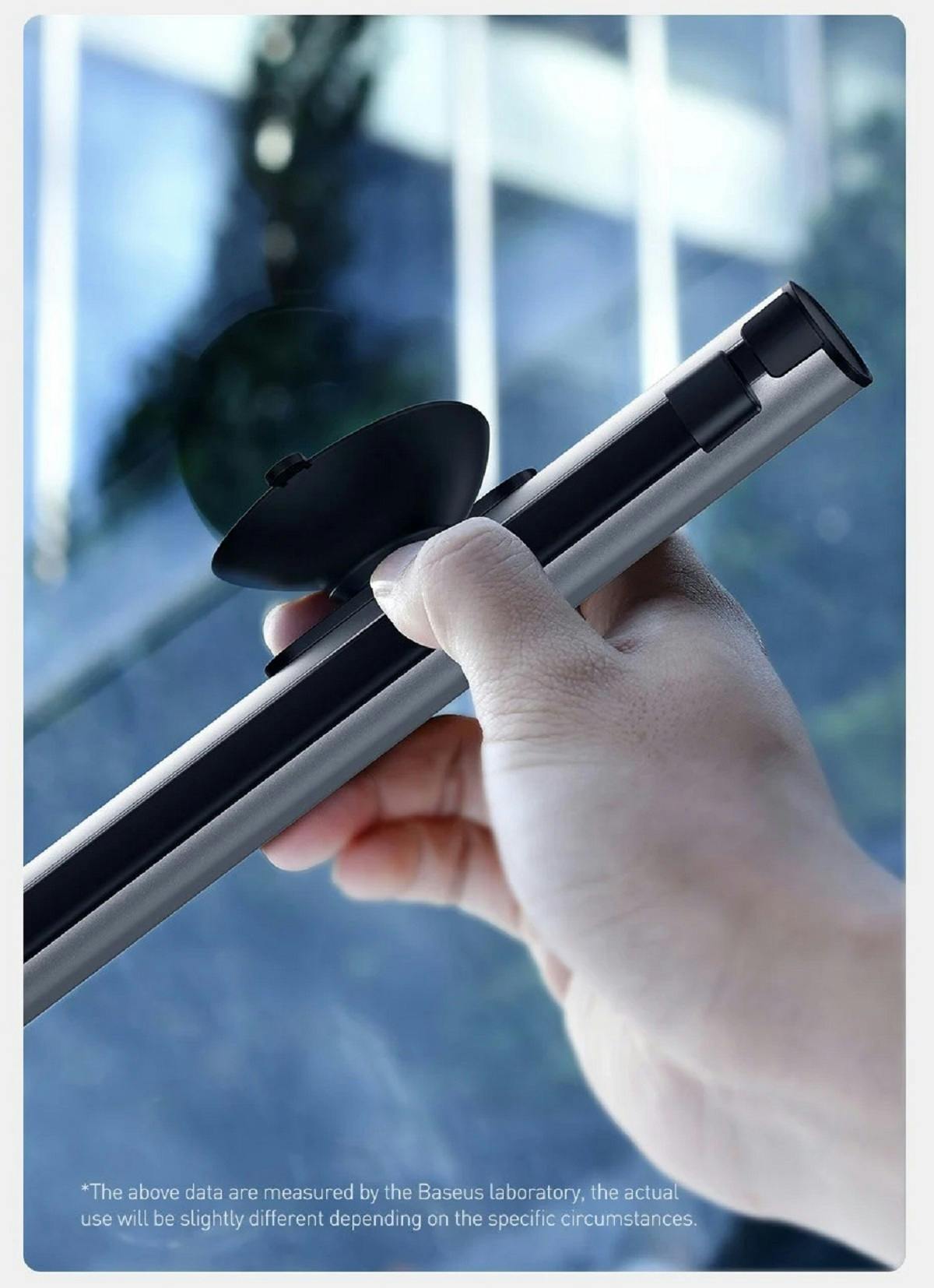 サンシェード本体は、以下の写真の様に、一本の棒状の形態になります。この中に、クロスが格納されており、これを引出して固定、また収納時は固定を外せば自動的に巻き取られます。(自動格納式) 非常にシンプル、スマートな取り扱いを実現しています。(下写真は左ハンドルの場合です。右ハンドル時は、フロントガラスの助手席側、左サイドへの装着となります)