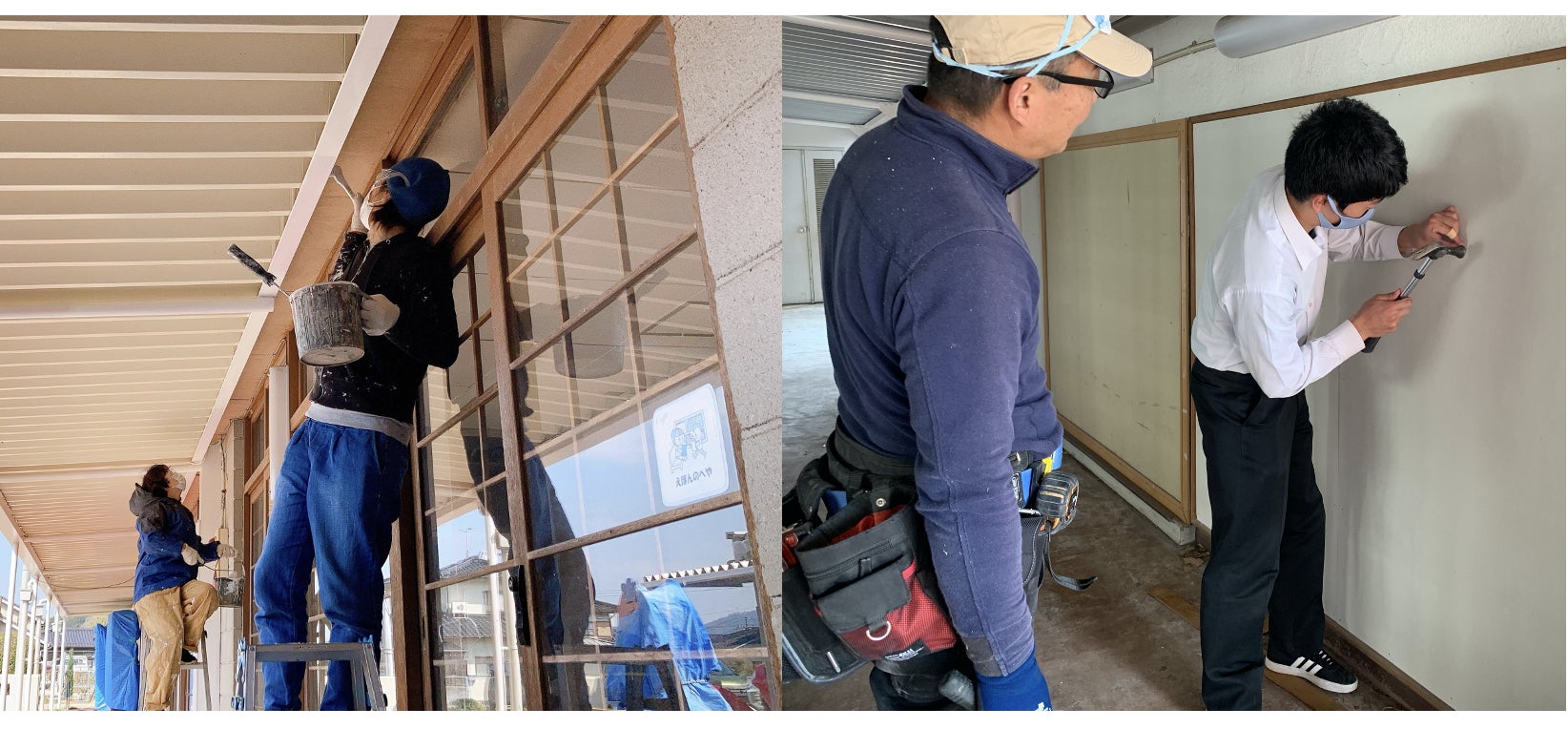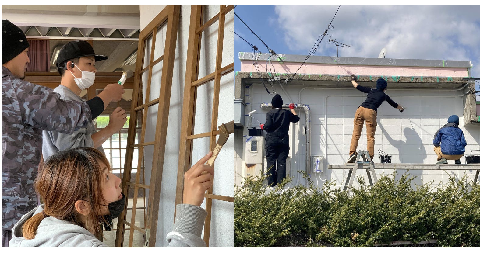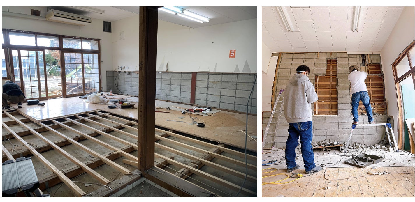 また、今回のプロジェクトは岡山県立大学畠研究室の学生のみなさんにご協力いただき、今回の建築デザインや改修に参画してくれました。今も県立大学生と一緒に施工にあたっています.。