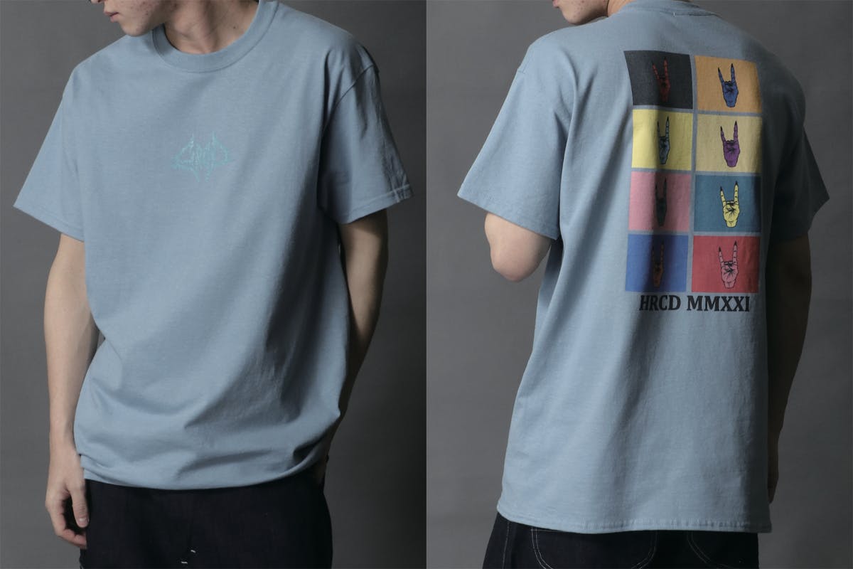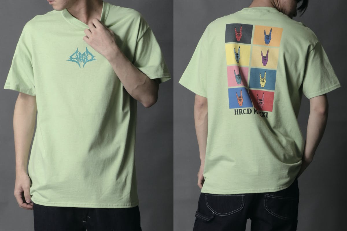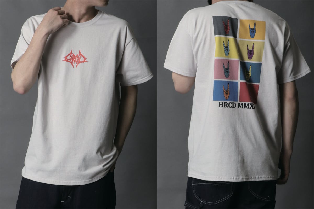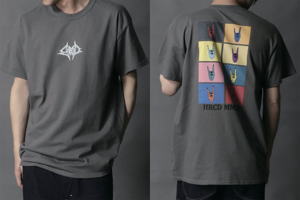 Tシャツのフロント(前面)にはブルータルなバンドロゴ風デザインのHRCDオリジナルロゴをプリント。ボディ(Tシャツ本体)の色に合わせて、カラーを変更しています。