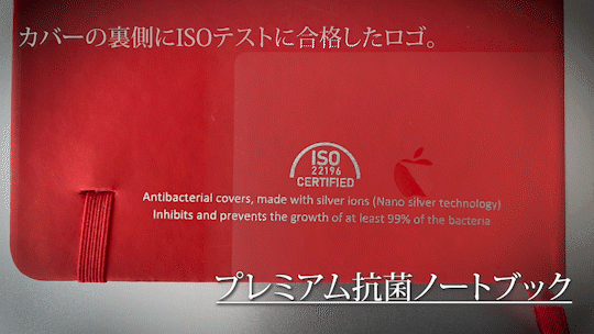PU抗菌カバー付A5サイズのノートブック。カバーの裏側にISOテストに合格した証のロゴがあります。