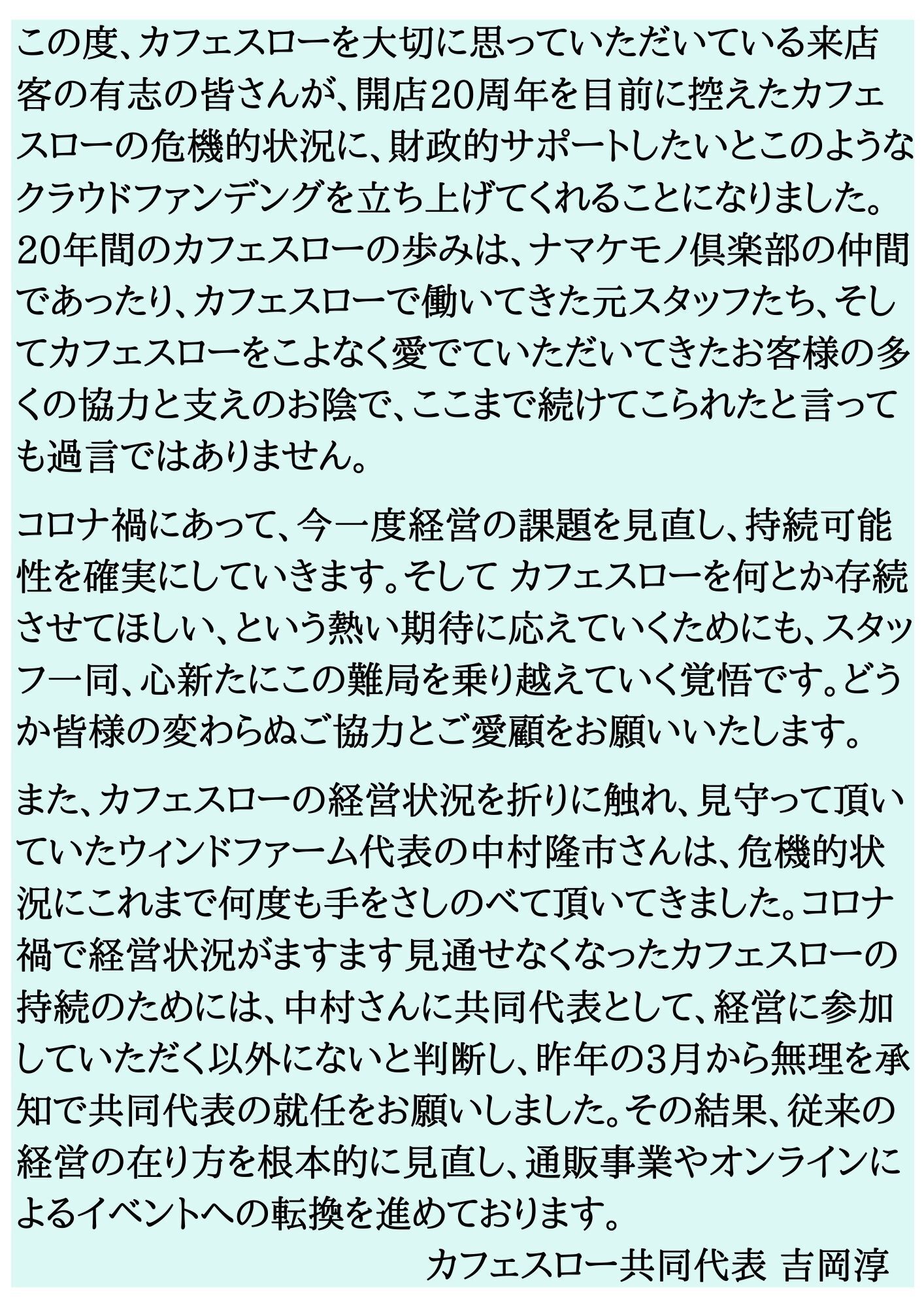 私たちはコロナウィルスの影響を受け、経営困難に追い込まれているカフェスローへの支援を呼びかけるために立ち上がった、有志メンバーです。