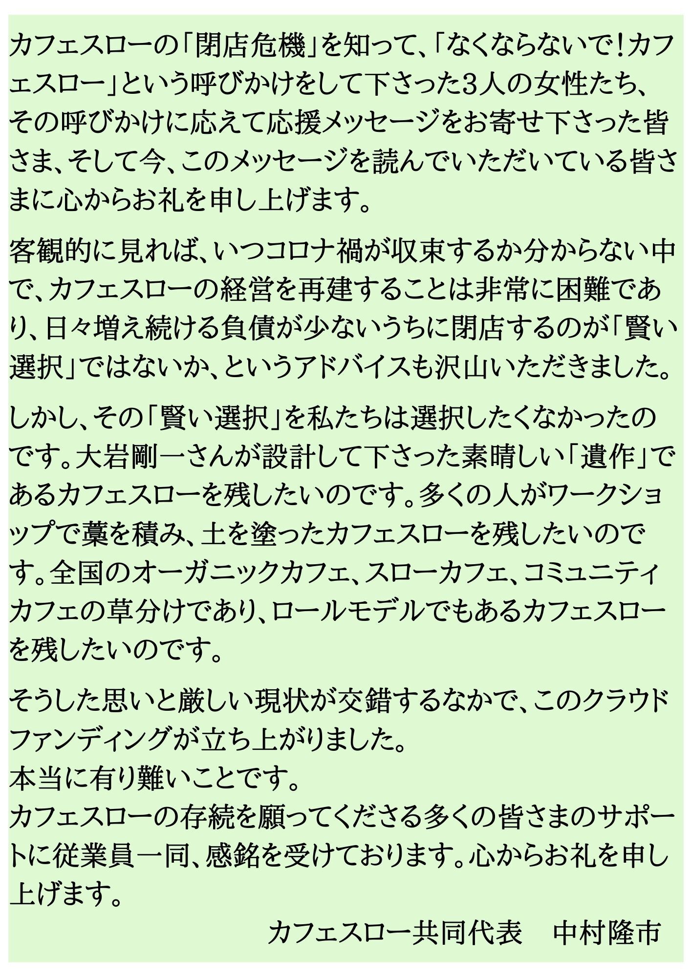 2021/03/31 12:11「なくならないで!カフェスロー みんなのカフェスローを未来に残したい」2月19日 12時にスタートしたクラウドファンディングは、3月28日 23時59分、無事に終了しました。皆さんからのご支援や応援メッセージが大きな力となって、782名の方から、目標額の160%を超える支援が集まりました!ありがとうの言葉では表しきれないくらい胸が一杯です。本当に本当に、ありがとうございました!!クラウドファンディングは終了しましたが、ここからまたカフェスローの歩みが始まります。応援してくださった皆さんとカフェスローが、これからもつながり続けますように。これから1つ1つ心を込めて、リターン(お礼品)の発送をします。気長にお待ち頂けると幸いです。スローパートナー一同・・・・・〜カフェスローからのメッセージ〜支援くださいました、みなさまへ。おかげさまで「782人、8,033,680円」という結果で、本当にたくさんの方からのご支援・暖かいお気持ちをいただくことができました。改めましてみなさまに支えられて、築き上げられてきた場所なのだと実感しております。ありがとうございます。5月22日の20周年を控え、これからも「みんなのカフェスロー」ということを胸に抱き、日々お店作り・場作りに努めて参りたいと思います。どうぞこれからも、一緒に、カフェスローを創っていただけたら、また応援いただけたら嬉しいです。簡単ではございますが、まずはお礼のご挨拶に代えさせていただきます。カフェスロー・・・・・8回にわたり、つながりトークをお送りしました。ご視聴、ご出演いただいたみなさま、ありがとうございました! もっと見る
