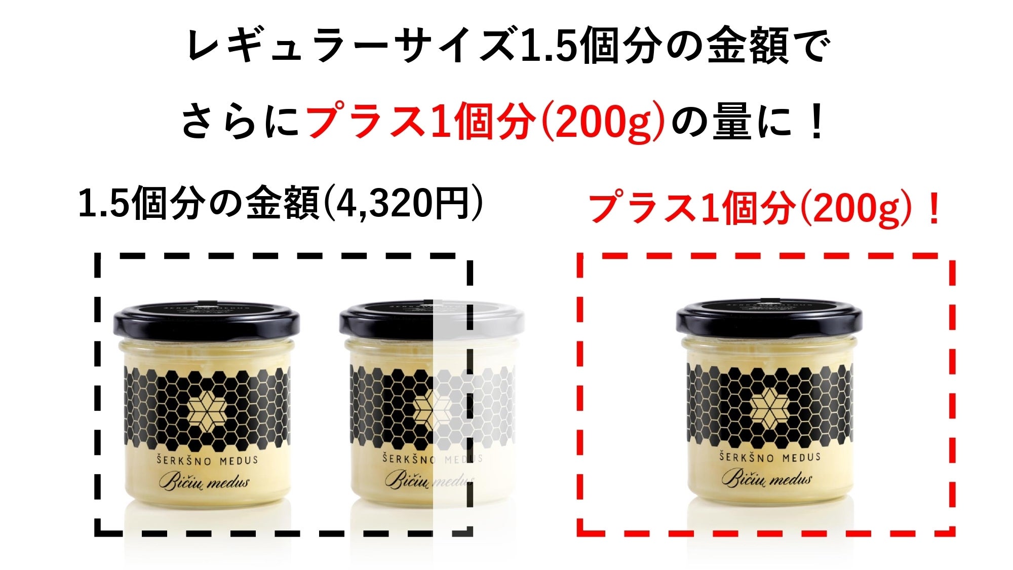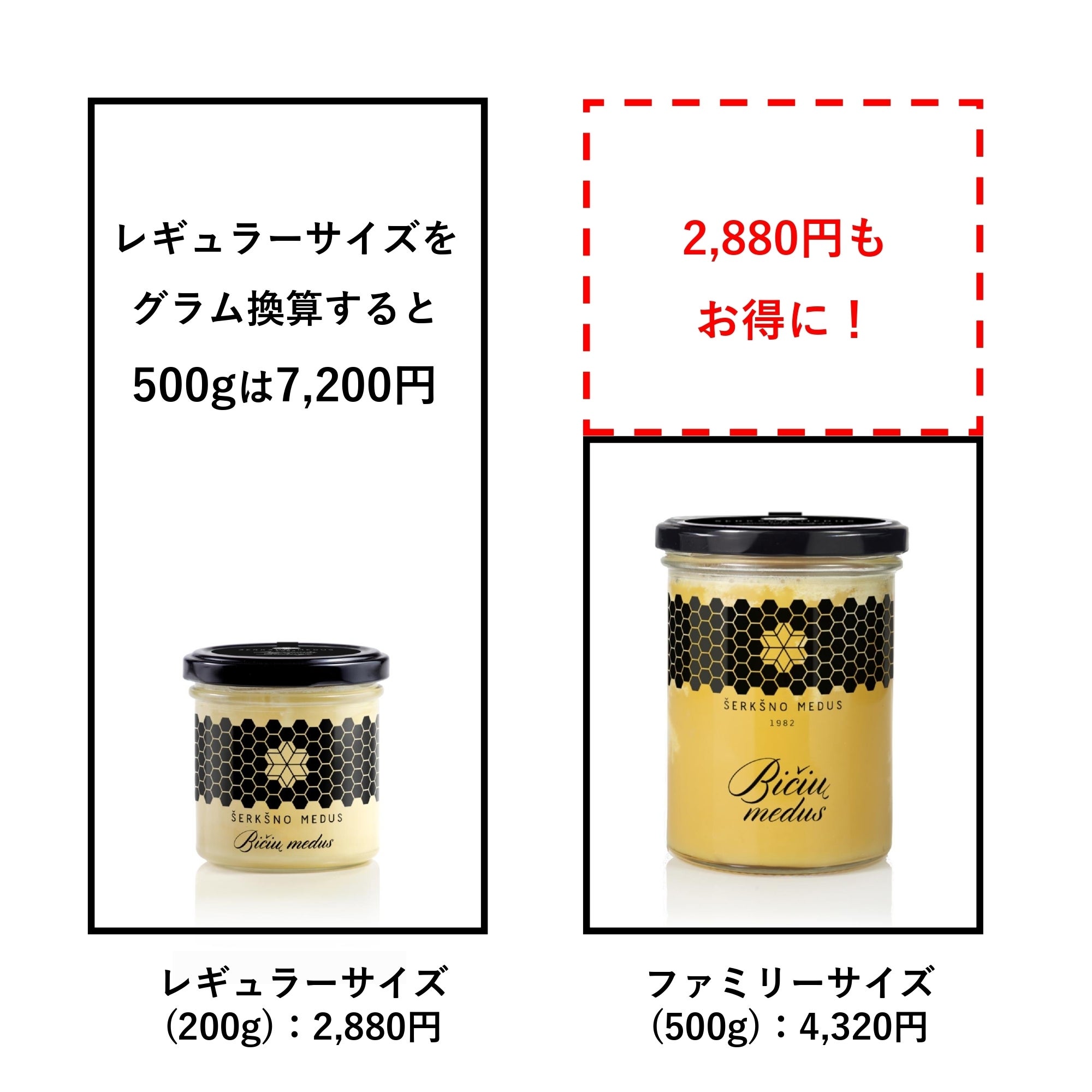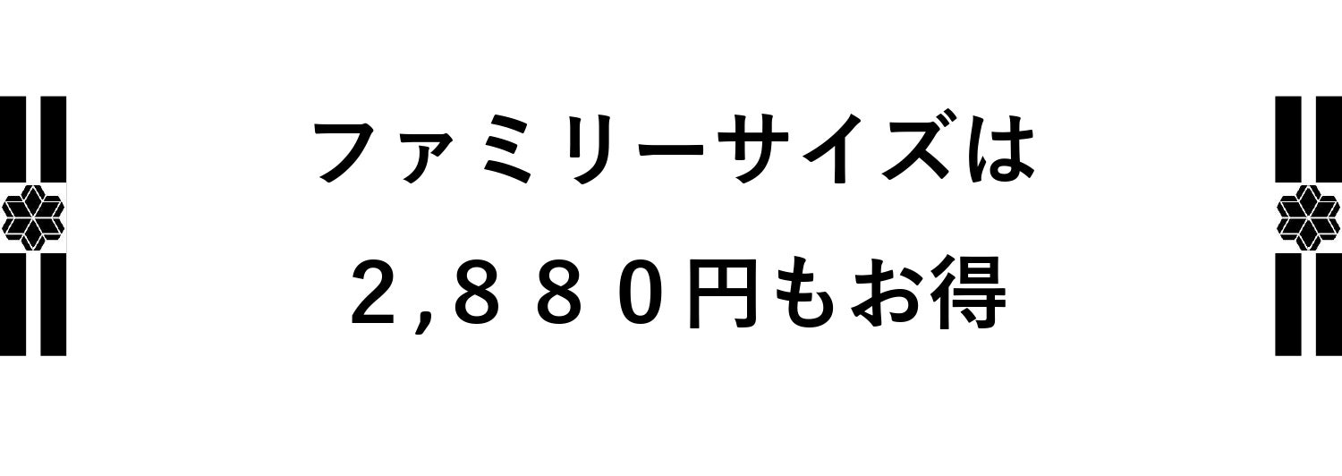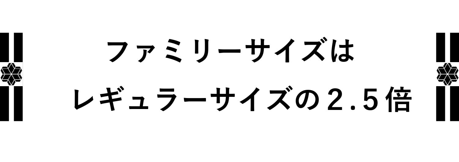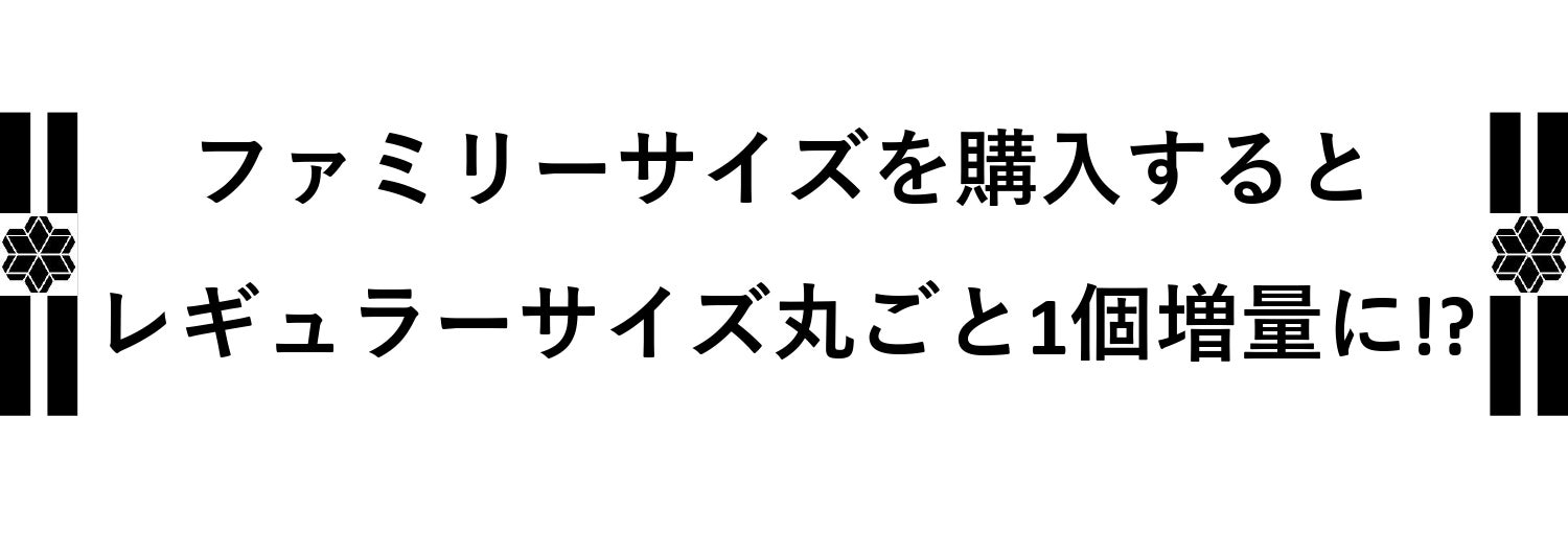 レギュラーサイズ1.5個分の金額は4,320円、容量は300g。それに対してファミリーサイズ1個の金額は4,320円、容量は500gです。つまり同じ価格でプラス200g(=レギュラーサイズ1個分)もお得になります。