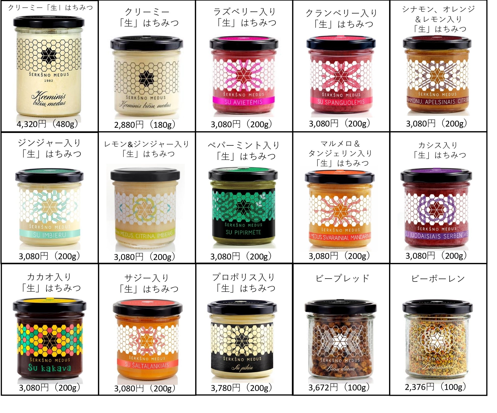 ※今回のプロジェクトで紹介しているリンデン高級「生」はちみつ(500g、200g)の2商品と下記の14種類 (15商品) の合計:15種類 (17商品) の中からお好きな商品をお選び頂けます。
