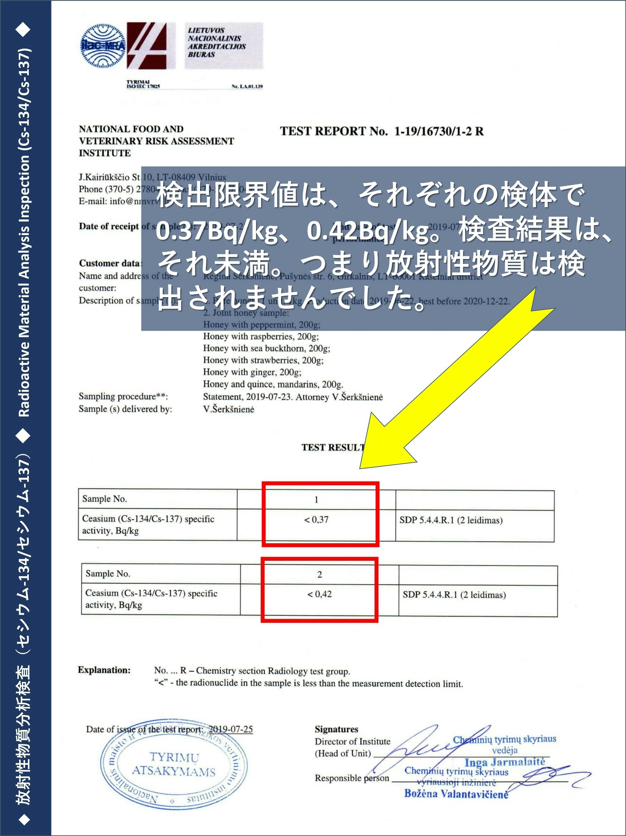 シェルクシュナス養蜂場では、農薬や化学物質は一切使用していませんが、農薬・化学物質・放射性物質の汚染がないかをリトアニア国立食品獣医学リスク分析研究所に検査を依頼し、その安全性を確認しています。2019年7月および2020年10月に実施した分析検査において農薬・化学物質・放射性物質は検出されませんでした。