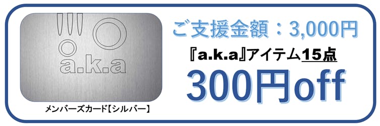 本格稼働後のECサイトにて、『a.k.a』商品を特別価格にてご利用いただけますご支援者様限定のメンバーズカードを発行させて頂きます。今後の定期的なご購入をお考えの方、ご友人やご家族との共同購入をお考えの方は是非、ご支援をご検討頂ければ幸いです。