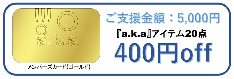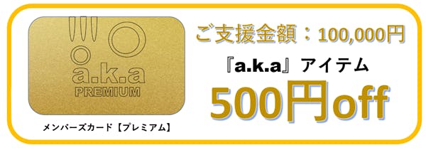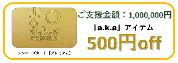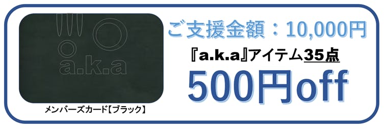 本格稼働後のECサイトにて、『a.k.a』商品を特別価格にてご利用いただけますご支援者様限定のメンバーズカードプレミアムを発行させて頂きます。