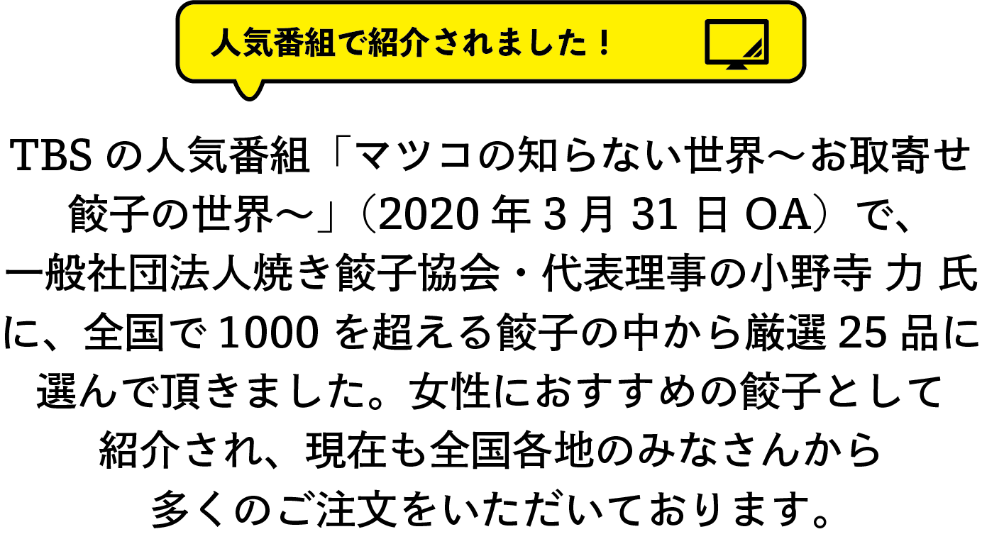 また、母自身がシングルマザーで仕事と子育ての両立に苦労した経験から「自宅で手軽に出来立てが味わえる、この餃子を通して、家庭の食卓を支えたい!」との思いで餃子をつくり続けています。