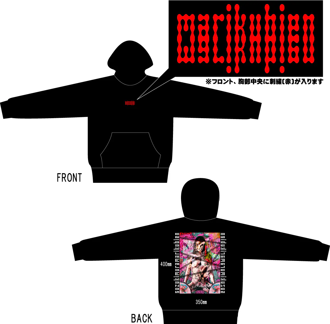 バックプリントのサイズは縦40㎝×横35㎝、全面胸部中央部分の刺繍(赤色)は縦4㎝×横8㎝。