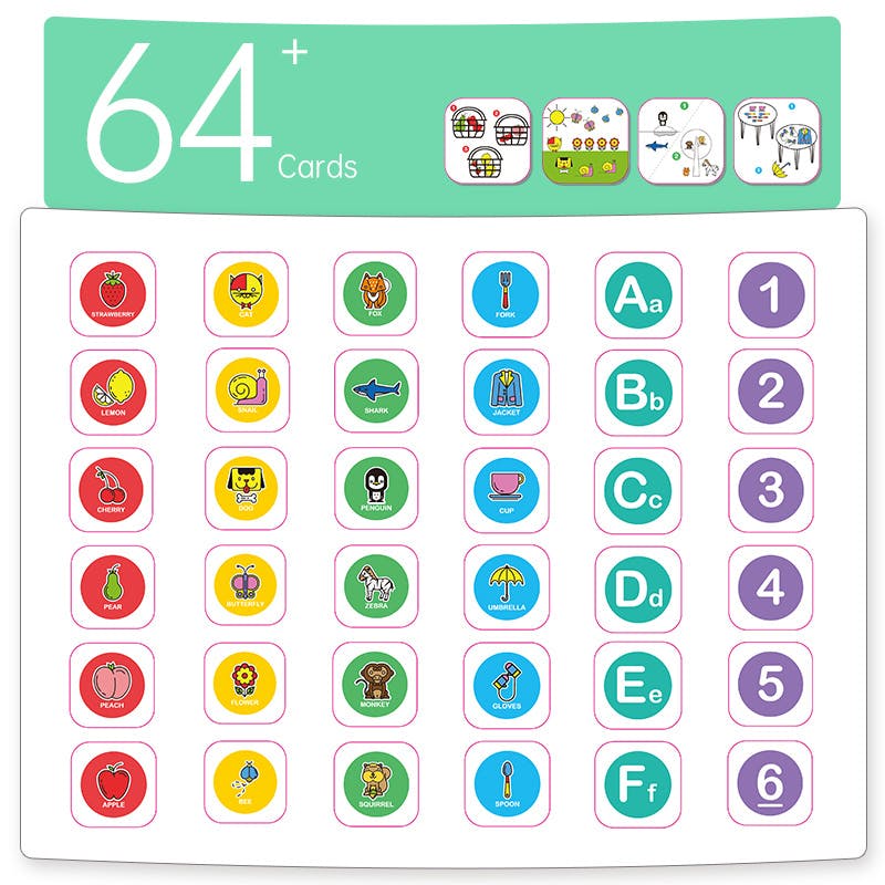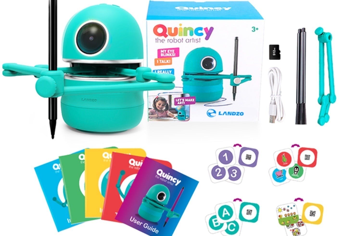 クインシーは、64枚のカードの裏にあるQRコードををロボットの目に読み込ませるだけで子供たちに様々なことを楽しく教えてくれます!