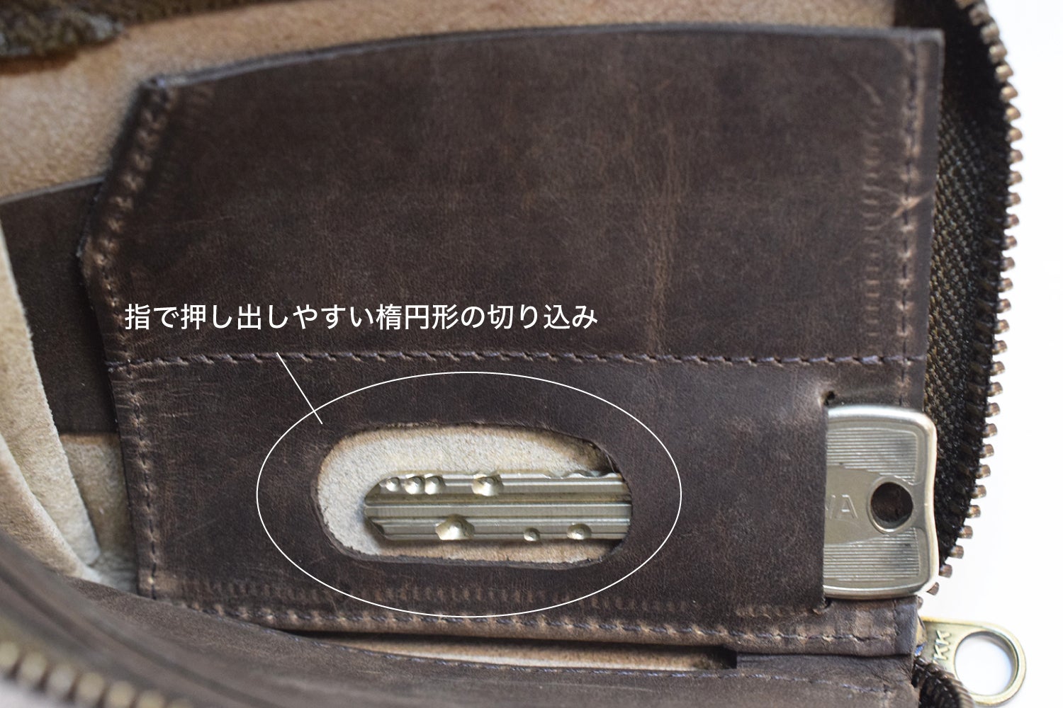 底にラウンド型に切り込みを1cm加えることで、小さい財布にありがちな窮屈さを解決しています。