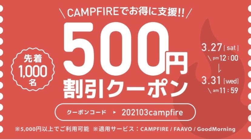 2021/03/27 22:145,000円以上の支援で使える500円の割引クーポンが発行されています!クーポンコード → 202103campfireご支援時のお支払い情報入力画面にて、クーポンコードをご入力ください!ぜひこの機会に宜しくお願い致します( ◠‿◠ ) もっと見る