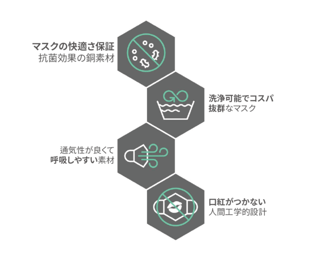マスクを長時間着用することで、マスク内部の温度が上昇し、湿気がたまることで菌が増殖しやすい環境になります。グラフェンテックスマスクには銅成分(UC)が含まれており、銅による抗菌・消臭効果で長時間着用しても快適かつ安心して使用していただけます。