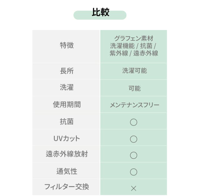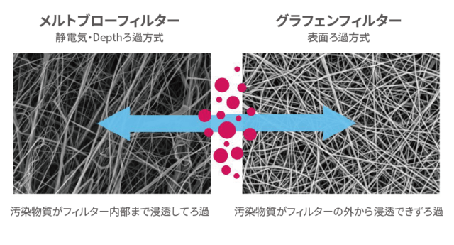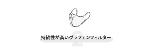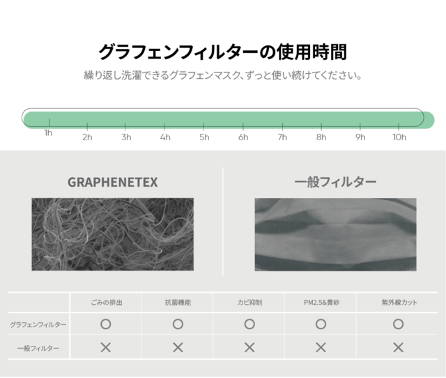 静電式フィルターは、着用時間が長くなればなるほどにつれて、外部から流入した汚れが蓄積されることでフィルタリング効果が低下する傾向ですが、グラフェンフィルターは表面ろ過方式だからこそ、フィルターのきめ細かいナノ構造が外部から流入する汚れの蓄積を防ぎ、洗濯することで新品同様の状態で継続使用することができます。