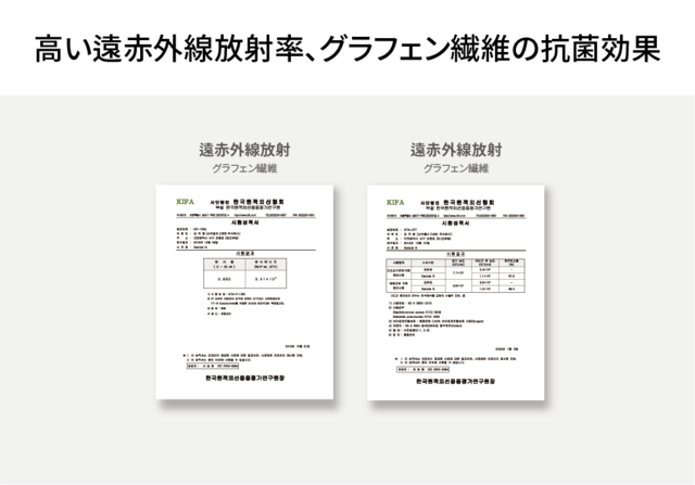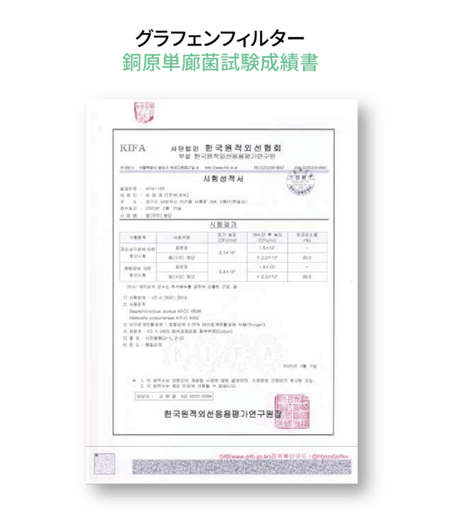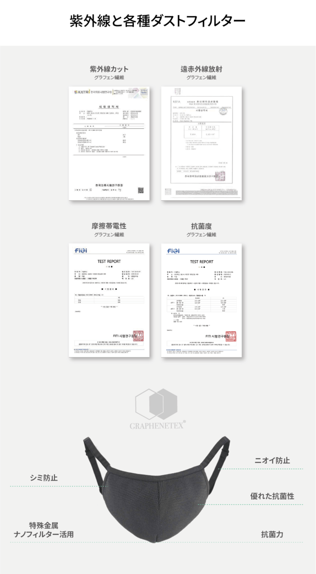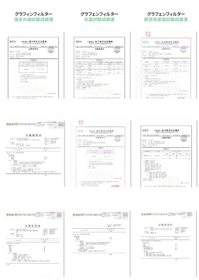 グラフェンフィルターの遠赤外線、肺炎菌、銅生地の抗菌、遠赤外線放射及び抗カビ、消臭、紫外線遮断、マスク洗濯後の菌の残存率テストなど計8種類の検証実験を行い、優秀な成績で証明取得しております。