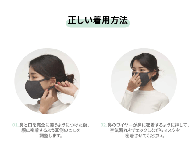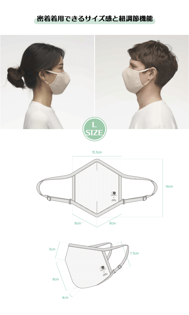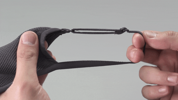 紐の長さを調整できる設計になっており、顔のサイズに合わせてサイズを調整することができます。なお、使い続けることで伸びてくる生地を紐の調整でフィット感を取り戻すことができます。