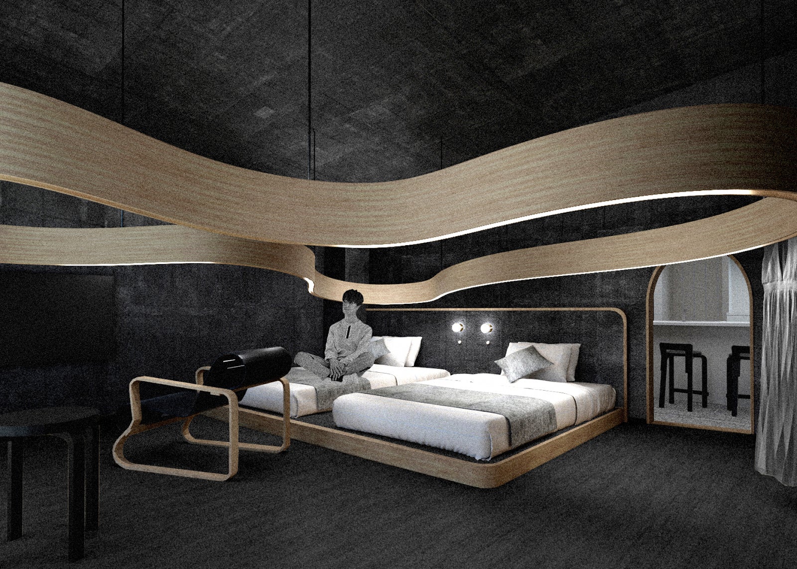 4階には、日本とオーストラリアを拠点に活動する、NIIMORI JAMISONの新森雄大さんとジェームス・ジャミソンさんによる、「清洲の曲物」に着想を得た、曲げ木の照明がゆるやかに居場所を照らす、落ち着いた雰囲気のお部屋。