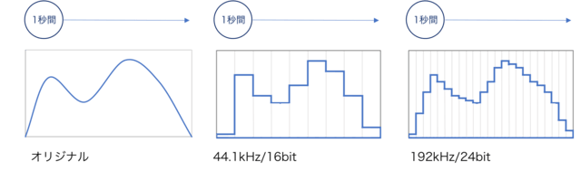 CDやハイレゾ音源は、原音をデジタル化したものです。ハイレゾ音源は、CDと比べてより細かくデジタル化し保存しているので、音の波形は原音に近い形を描きます。