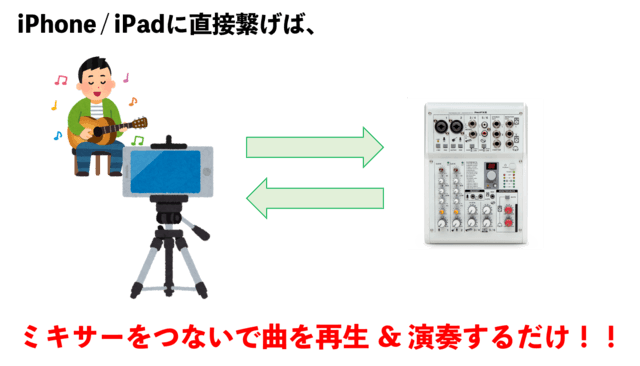 iPhone/iPodをUSB接続したミキサーに演奏曲を再生するプレイヤー、演奏楽器を接続し、それぞれの音量を確認し調節しておきます。