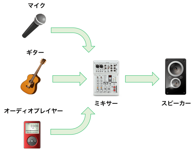 ですが!ミキサーがあれば、各機材の音をミキサーでひとまとめにして、スピーカーひとつで音が出せるようになります!