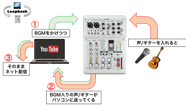 ●ループバック機能がない場合・・・ パソコンのスピーカーからBGMを流し、そのBGMと配信者の声をマイクで拾い、それらをミキサーでまとめてパソコンに送る。この場合、その場の環境音も一緒に収音されるため音質が悪くなります。