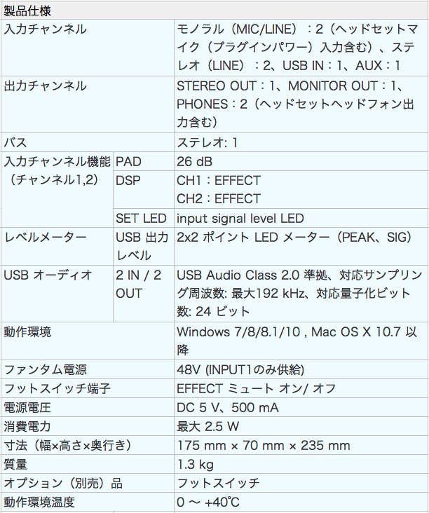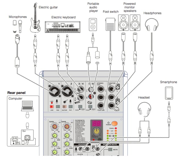 ヘッドセットマイク端子、コンデンサーマイクも接続できるファンタム電源(INPUT1のみ)を搭載したマイク入力端子、Hi-Zに対応しギターやベースを直接接続できる入力端子、キーボードの接続に対応したライン入力端子など、豊富な入力端子を備えています。