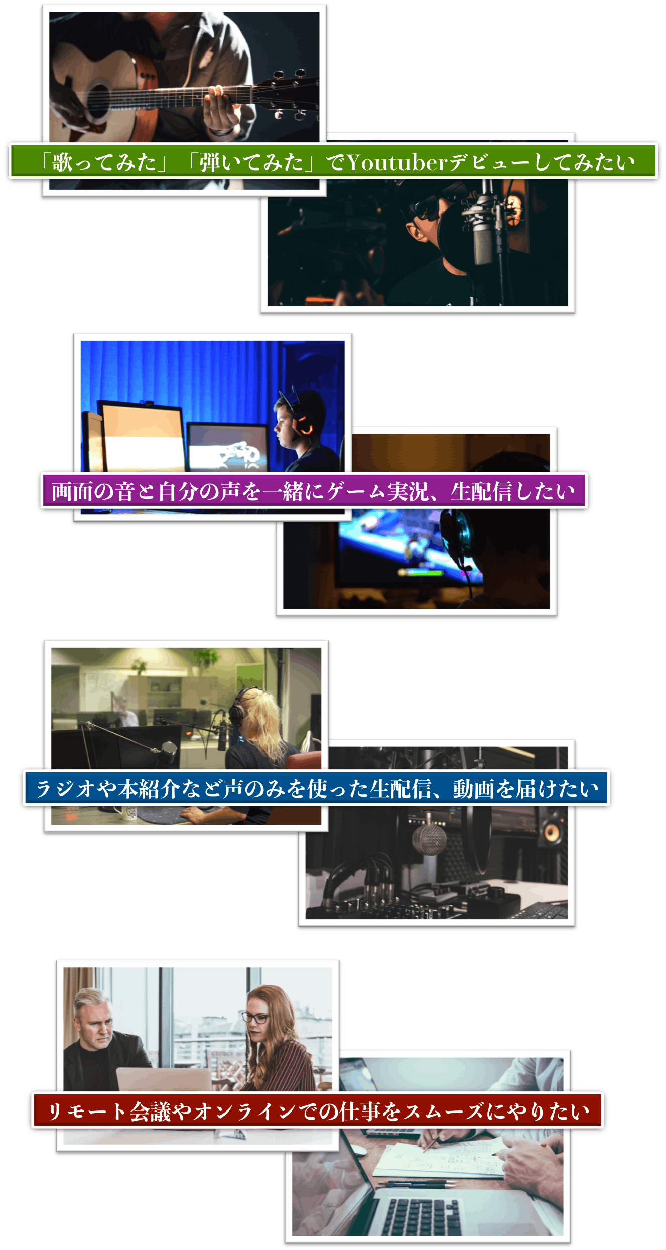 「”歌ってみた”や”弾いてみた”でYouTuberデビューしてみたい。」 「画面の音と自分の声を一緒にゲーム実況、生配信したい。」 「ラジオや本紹介など声のみを使った生配信、動画を届けたい。」 「リモート会議やオンラインでの仕事をよりスムーズにしたい。」 「動画音声のクオリティを上げ、視聴者に高音質で届けたい。」 など、