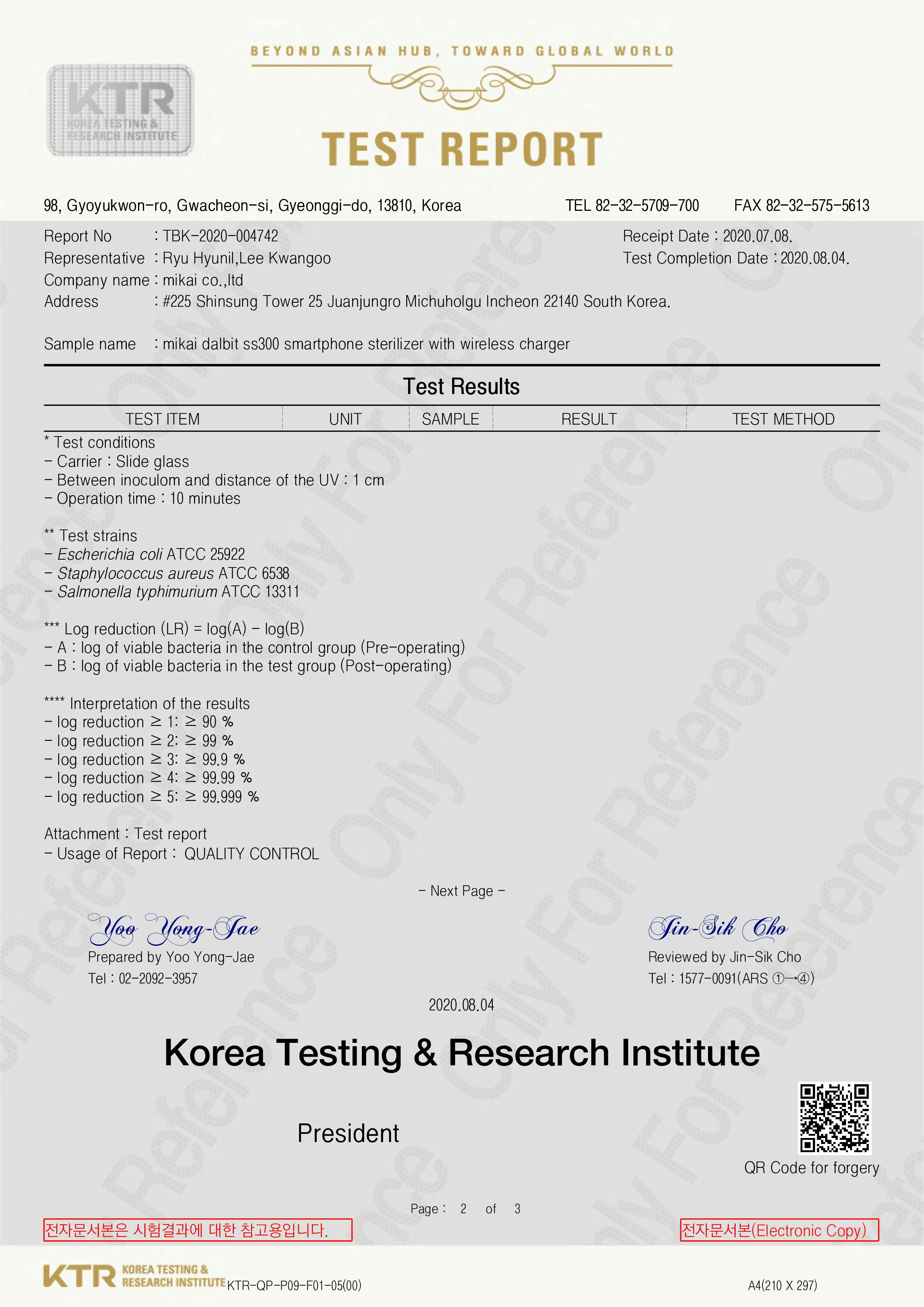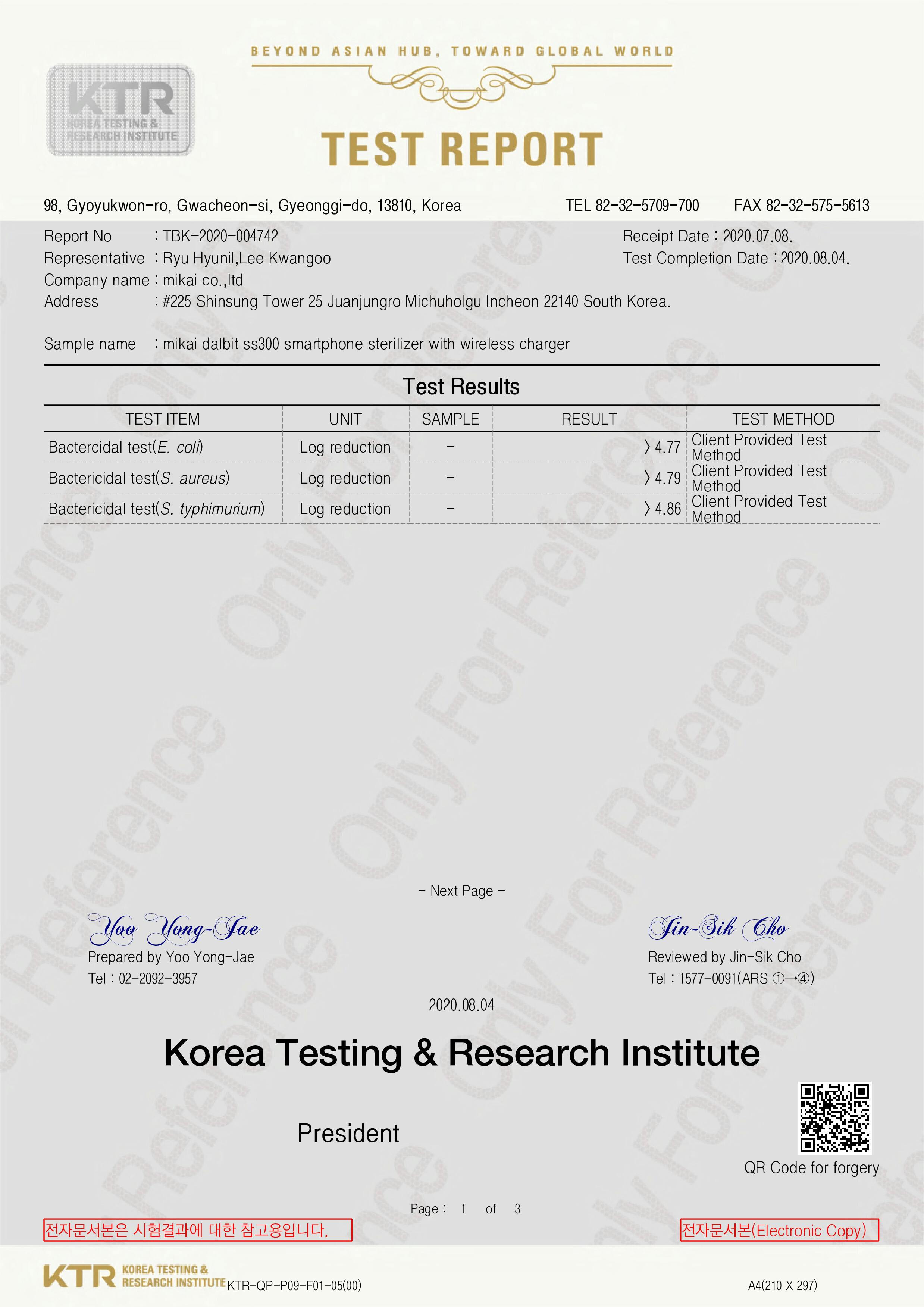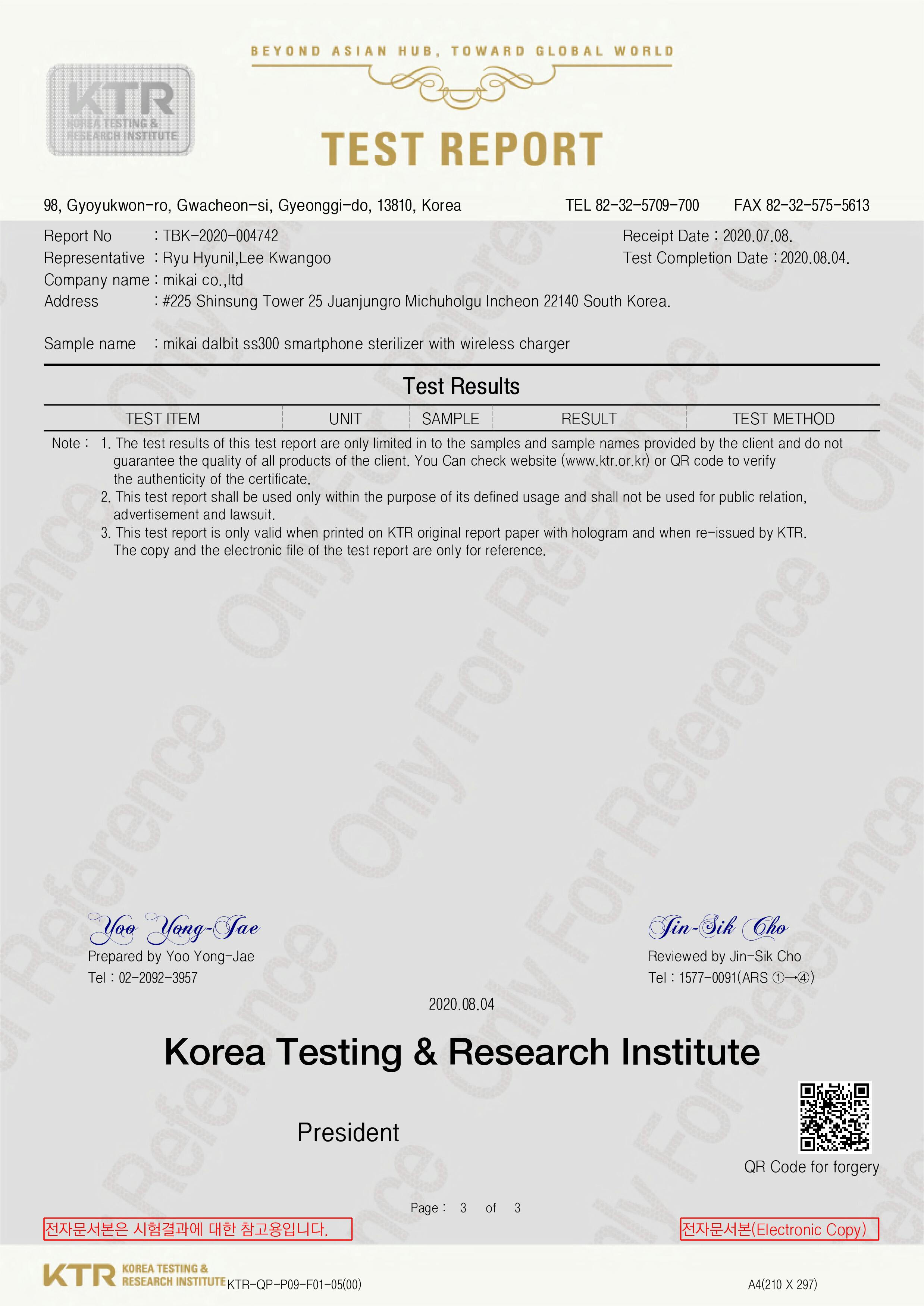 韓国公認試験期間(KTR・韓国化学融合試験研究所)より、この製品のテストをした結果、