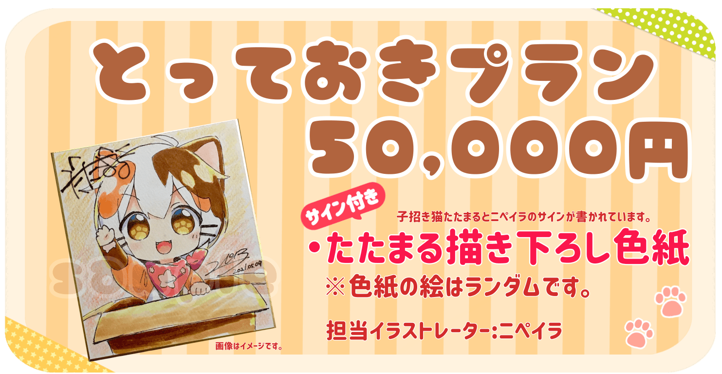 子招き猫たたまると二ぺイラのサインが書かれています。