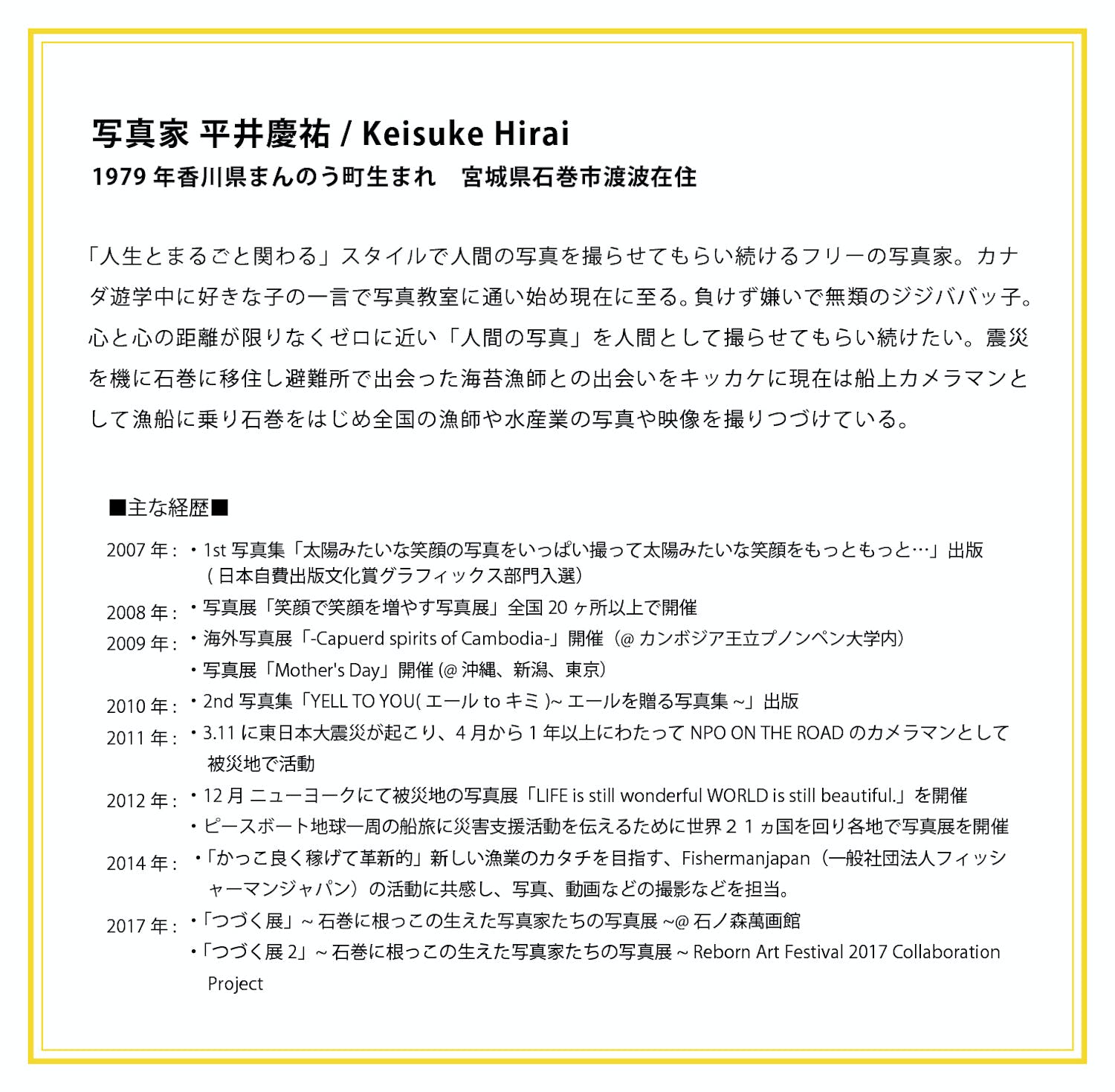 はじめまして、石巻在住の写真家 平井慶祐(ひらいけいすけ)です。