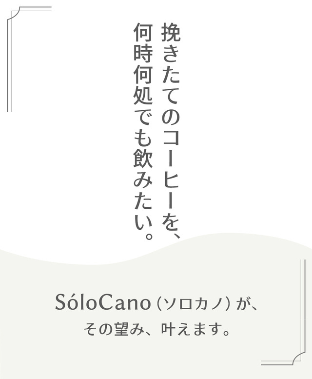 すべてのコーヒー愛好家の方にいつでもどこでも美味しい挽きたてコーヒーを気軽に楽しんで頂きたいと思っております。SóloCanoはボタン一つでいつでもどこでも挽きたてコーヒーが飲めとても便利な商品ですし、使い捨てフィルターがいらないのでエコで地球にやさしいし、長く使うとお財布にもやさしい商品です!すべてのコーヒー好きな方におススメしたいです。