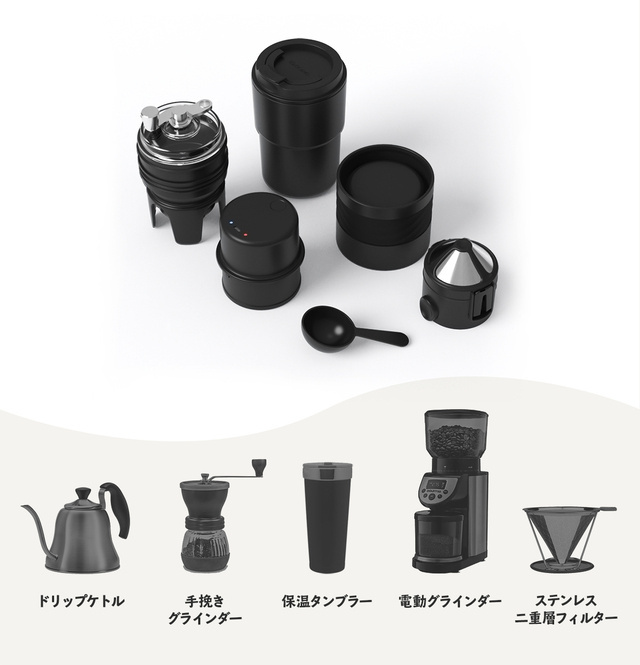 SOLOCANOx1個(タンブラー、グラインダー、ドリッパー、ケトル、フィルター、モーター各1)、収納ケース、USBケーブル、はけ、スプーン、日本語説明書