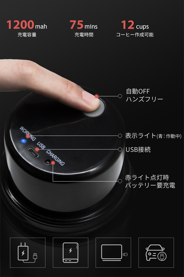 A:充電が完了するには約45分かかります。1200mAhのリチウム電池を使用するように設計されており、充電満タンの状態からだと、少なくとも12回は豆をひくことができます。そして自動的に豆ひきのプロセスが終了すると自動で停止します。