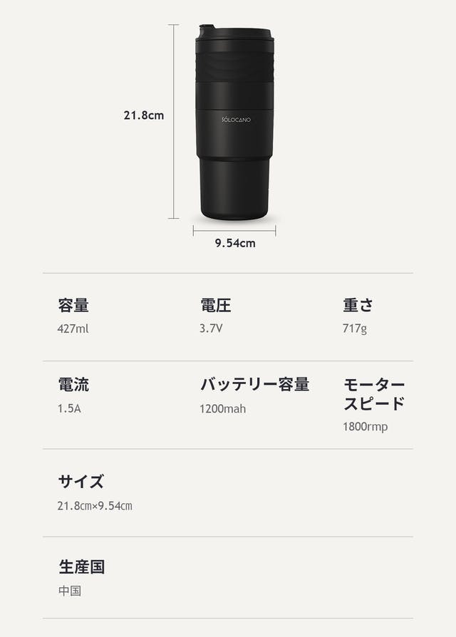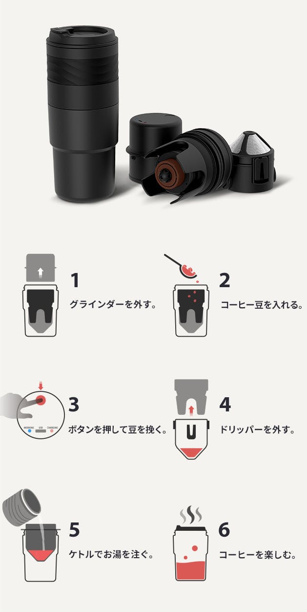 まず箱を開けてみるとまるで望遠レンズの ようなしっかりとした作りにテンション上げ。 だけど、特に女性が持ち歩くには少し重いしデカいかも。 電動ミルを使ってコーヒーを入れみると、 うまい! 飲み口は少し出っ張りがあるが、 あまり気にならなかった。 カップの底にゴムがあるのが地味に 嬉しい。保温性もありそうで良い。 安っぽくないのも好き。 バッテリー残量が見えないが残念。ミルの下に豆の挽き方を選べるノブが! 細引きが好きな自分にはこれは嬉しい!職場に置いておく使い方が一番合いそう。 あとは一人暮らしの男性も案外好きかも。 キャンプは一回に淹れられる量が少ないから 少人数なら持って行くかも。 うちは手びきのミルを面倒くさくって 使わなくなってしまったので、 いまのところ毎朝使ってます。