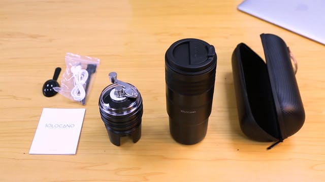 SOLOCANOx1個(タンブラー、グラインダー、ドリッパー、ケトル、フィルター、モーター各1)、収納ケース、USBケーブル、はけ、スプーン、日本語説明書