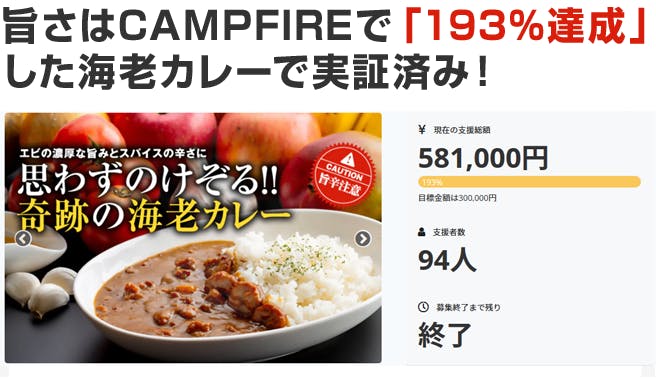2020 年「奇跡の海老カレー」がキャンプファイヤーにて目標の193%を達成