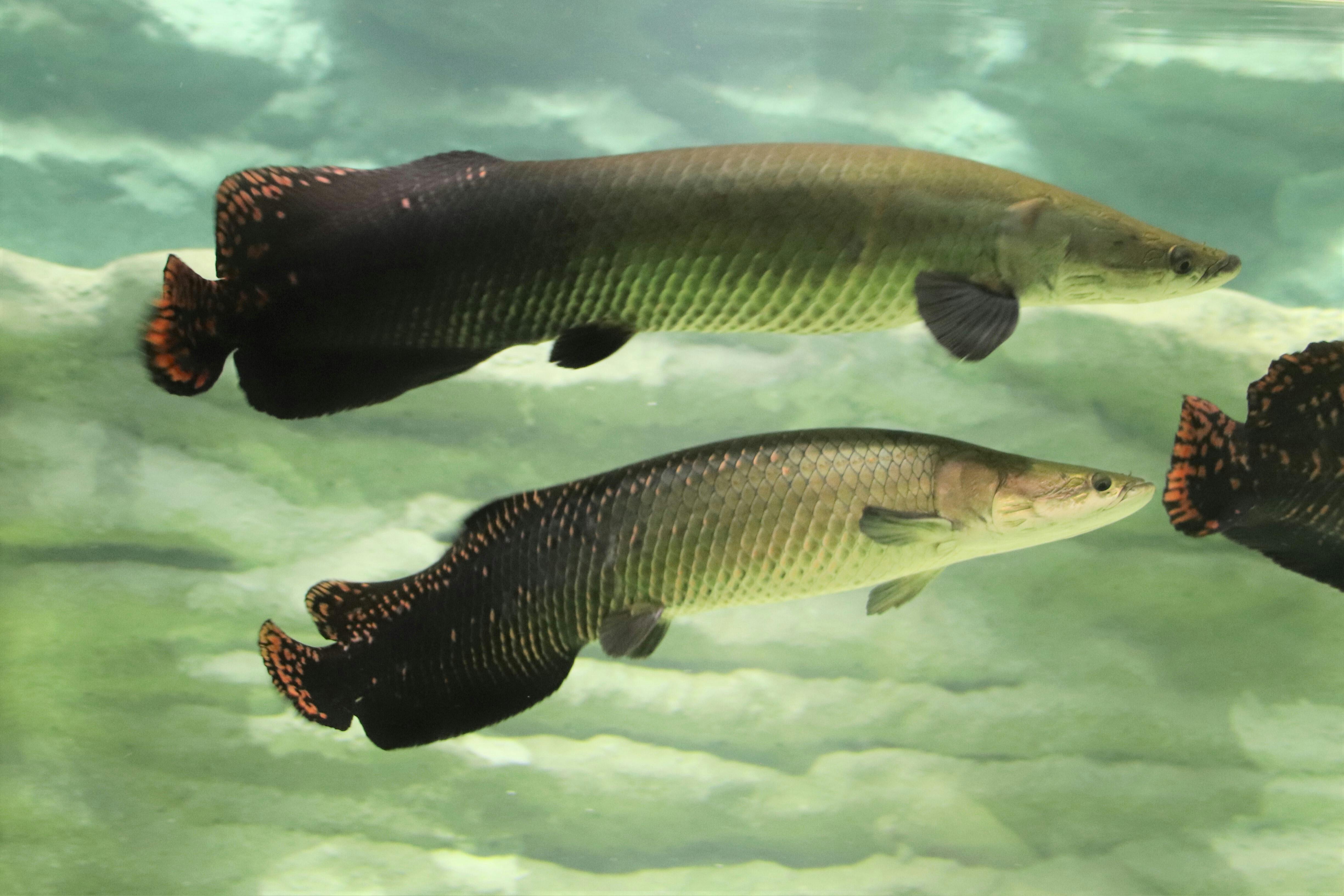 世界最大の淡水魚として有名で、体長4m以上、体重200㎏の記録があります。古くから姿形を変えていない古代魚としても有名です。現地の言葉で「Pira(ピラ)」は魚、赤い実をつける樹木の「Urucu(ウルク)」を合わせてこの名が付けられました。