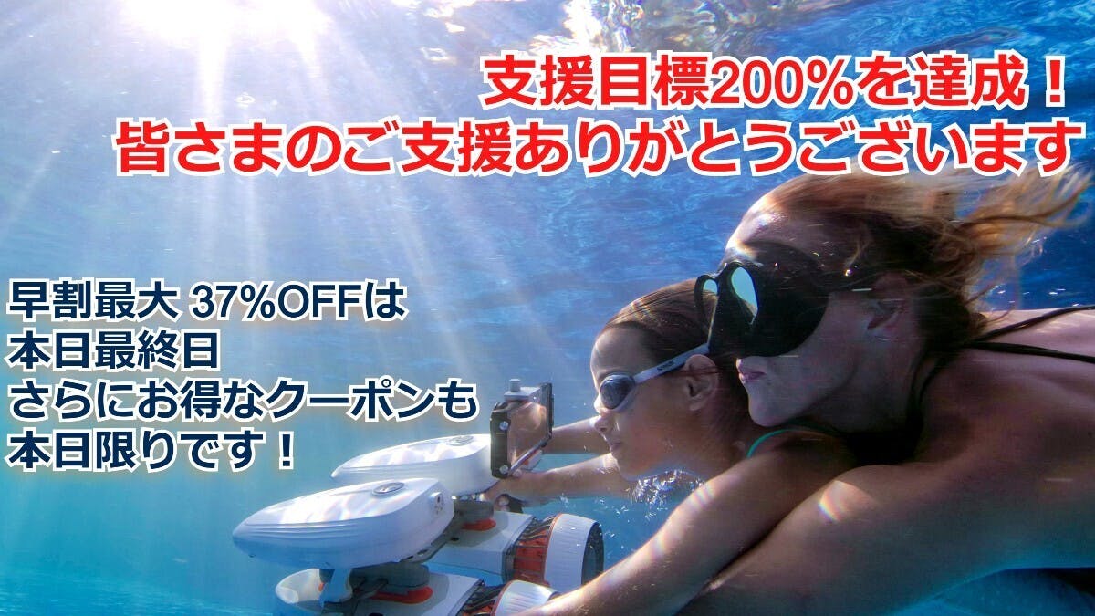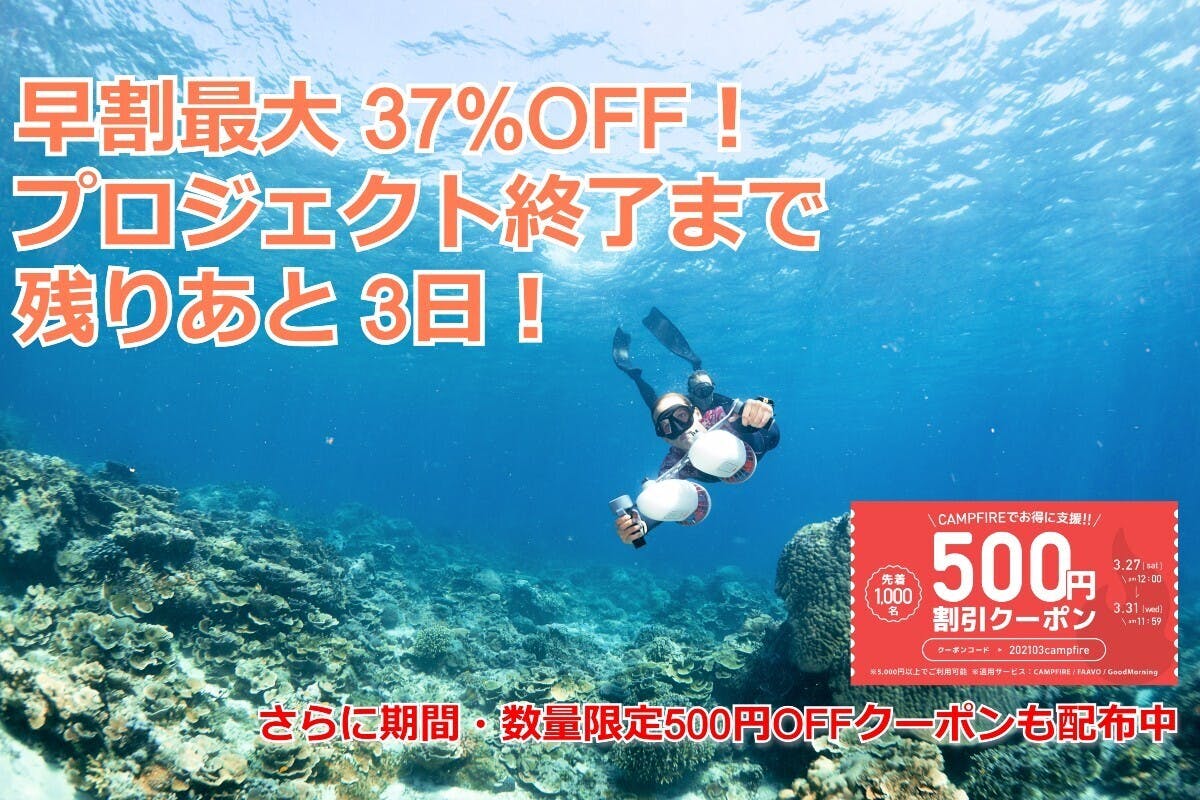2021/03/29 19:00支援目標180%を達成!皆さまのご支援ありがとうございます!プロジェクト終了まで残り3日となり、これまでに約180万円のご支援を頂き本当にありがとうございます。さらにお得な500円OFFクーポン配布中!最大37%OFFのプロジェクトは残り3日!たくさんの方にその魅力を共感頂き、ご支援頂いている自在に選べる新型水中スクーター「WhiteShark Tini」を、さらに多くの方にお使い頂くため期間限定先着1,000名様に「500円OFFクーポン」をプレゼントいたします。ご支援の際にクーポンコード「202103campfire」をご入力ください。※ 先着1,000名に達した際はお使い頂けませんのでご了承ください。※ クーポンについて詳細はこちら★さらに楽天ポイントモール では12%ポイントバックのお得なキャンペーン開催中!「楽天ポイントモールキャンペーン」詳細オリンピックメダリストと水泳対決!ブーストイ★スタジアム放送決定!プロジェクト終了後の4月3日(土)14:00~ 日本テレビにて放送予定のTV番組「究極のスポーツ対戦!ブーストイ★スタジアム」で、アスリートvs芸能人の対戦をサポートする「ブーストイ」にクラス最速を誇る水中スクーター WhiteShark Tini が選ばれました!お笑い第7世代を代表する「四千頭身」の3人とジャニーズJr.の人気グループ HiHi Jets の「井上瑞稀 」さんの4名が、ロンドン・リオオリンピック2大会連続バタフライ銅メダリストの「星奈津美」さんと水泳対決。カナヅチ2名を含む芸能人チームをブーストさせるアイテムとして WhiteShark Tini もメダリストに挑戦します。人気芸能人×最速水中スクーター vs オリンピックメダリスト の勝負をぜひお楽しみください。4月3日(土)14:00~ 日本テレビにて放送予定「究極のスポーツ対戦!ブーストイ★スタジアム」番組WEBページ:https://www.ntv.co.jp/boostoy/番組ツイッター:https://twitter.com/NTV_OIYAMADコンパクトにもパワフルにも使えて、様々なニーズにも対応する ウォーターアクティビティの新しいパートナー WhiteShark Tini をより多くの方にお使い頂くため、引き続きその魅力をお伝えしていきますので、よろしくお願いいたします。 すでにご支援頂き、到着をお待ちの方や、WhiteShark Tini の魅力に共感頂いた方は、ぜひその魅力をSNSなどでご紹介頂ければ幸いです。 セキドのSNSはこちら。・facebook :https://www.facebook.com/sekidorc/・Twitter :https://twitter.com/SekidoCorp・Instagram:(セキド)https://www.instagram.com/sekido.co/ (Sublue JAPAN)https://www.instagram.com/sublue.japan/・LINE:https://lin.ee/IYXNQuO もっと見る